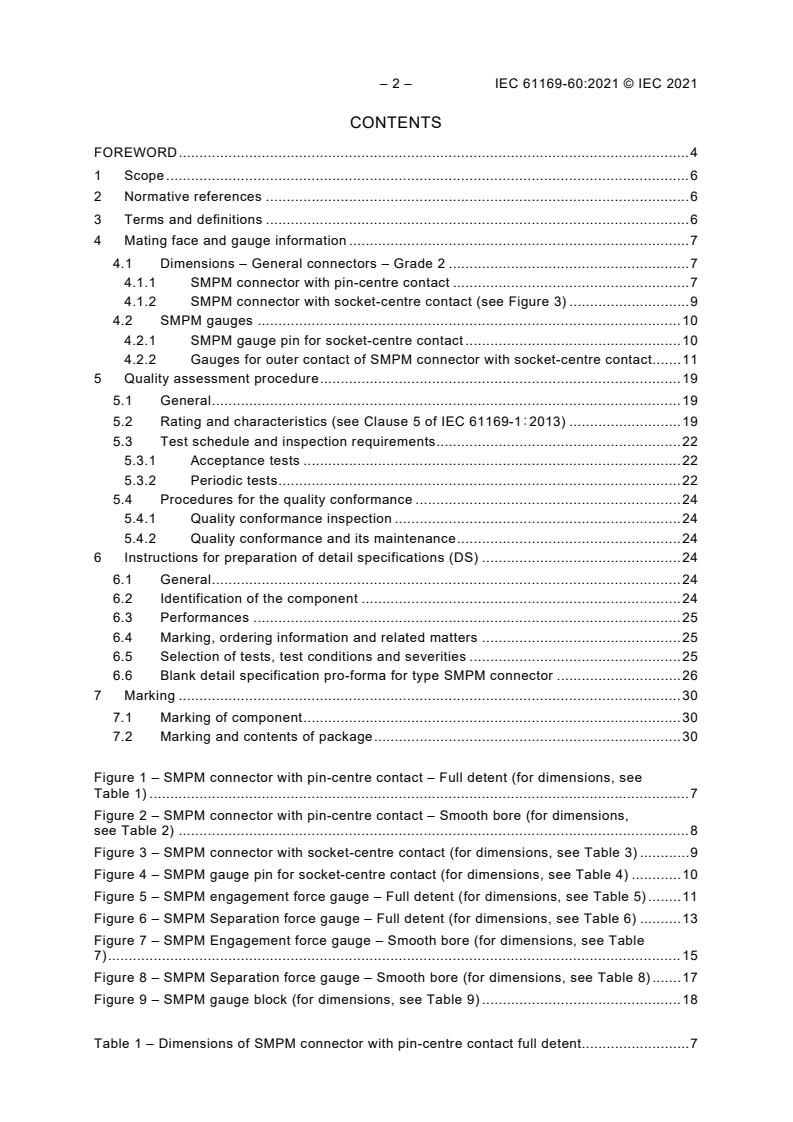 문서 제목: IEC 61169-60:2021 - 무선 주파수 커넥터 - 제 60편: 푸시 온 메이팅과 특성 임피던스 50 옴 (SMPM)을 가진 RF 동축 커넥터에 관한 구분 명세 문서 내용: IEC 61169-60:2021은 50 옴 RF 케이블이나 마이크로스트립에서 주로 사용되는 RF 동축 커넥터의 상세 명세 (DS)를 작성하기 위한 정보와 규칙을 제공합니다. 이 명세는 마이크로파, 통신, 무선 시스템 및 기타 분야에서 사용되는 일반목적 커넥터 - 2등급, 표준 테스트 커넥터 - 0등급의 치수 세부 정보, IEC 61169-1에서 선택된 측정 정보 및 테스트를 지정합니다. 이 명세는 상세 명세를 작성할 때 고려해야 할 권장 성능 특성을 나타내며, 평가 단계 M과 H에 대한 테스트 일정과 검사 요구 사항을 다룹니다.