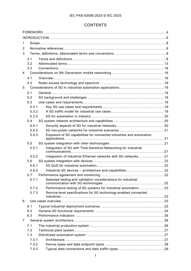 IEC PAS 63595:2025 - Industrial networks - 5G communication technology - General considerations provides a pre-standard framework for applying 5G (IMT-2020 / 3GPP Release 15 and beyond) cellular wireless technologies to industrial process measurement and control. The PAS gives common terminology, generic system descriptions, and representative use cases, and it sets out requirements and guidance for users, system designers, device manufacturers and integrators. This publicly available specification focuses on cellular 5G terrestrial radio interfaces; non‑cellular NR+ (stand‑alone professional systems) are explicitly excluded. Note: as a PAS, it is a pre-standard subject to potential conversion into a standards series and will be withdrawn automatically after four years.