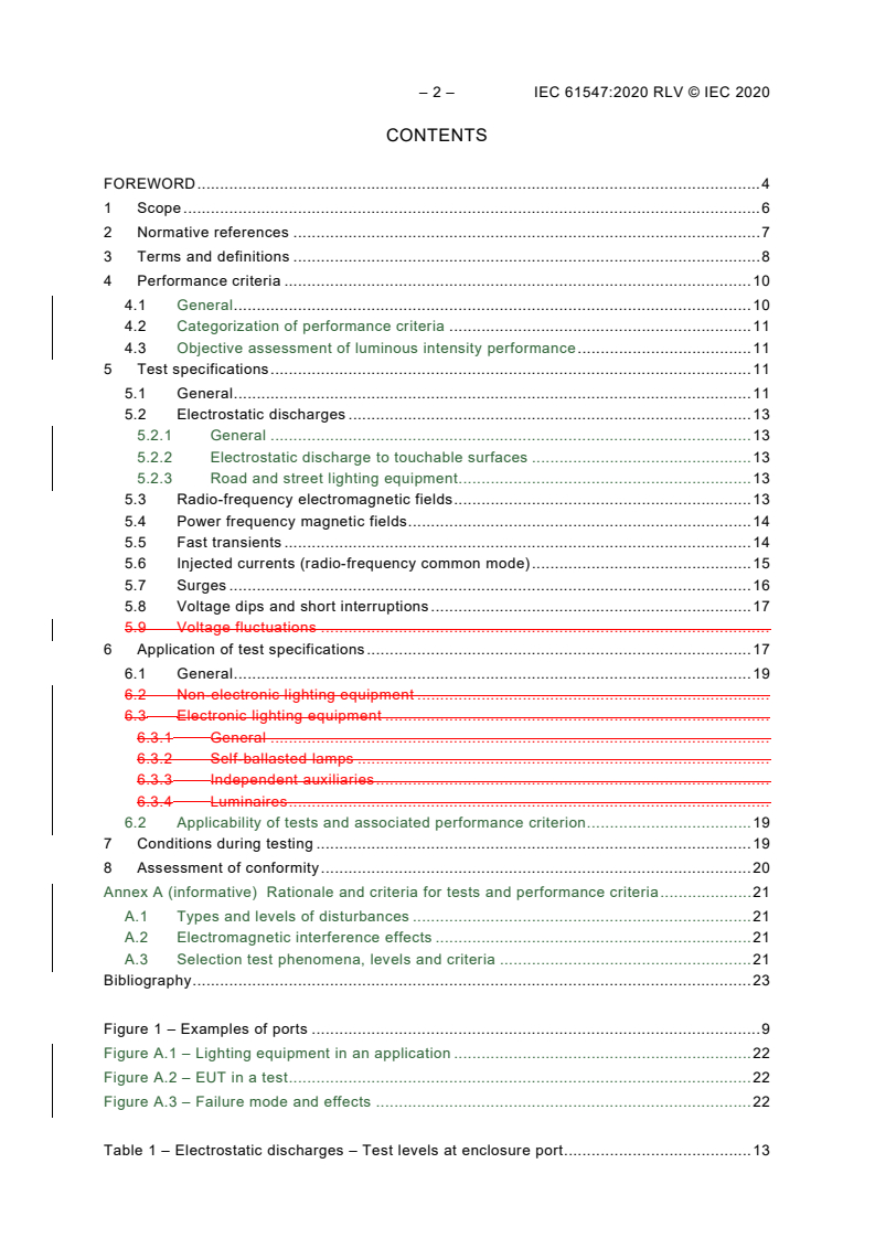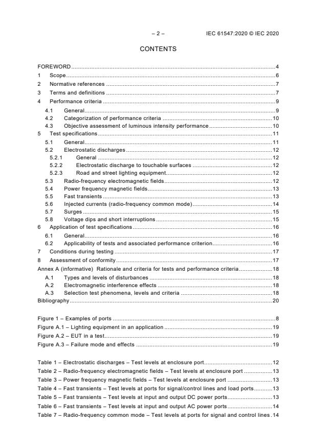 IEC 61547:2020 specifies test phenomena, levels and performance criteria for electromagnetic immunity of lighting equipment. Key technical topics include: