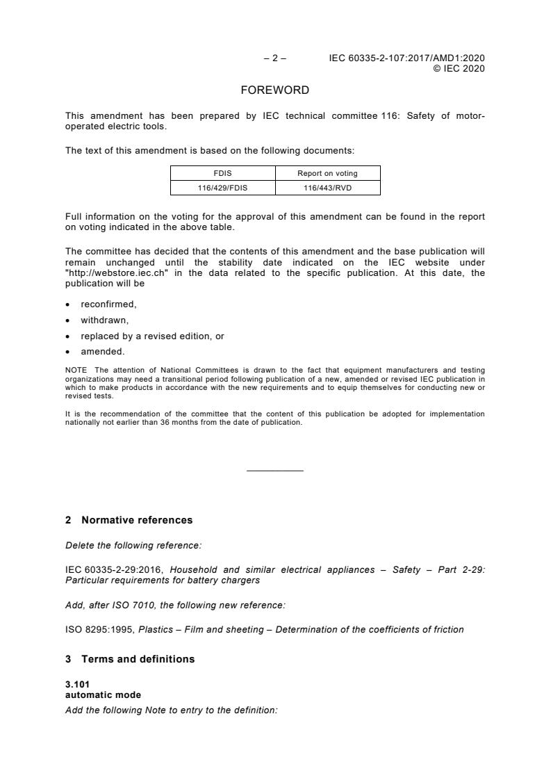 IEC 60335-2-107:2017/AMD1:2020 is an important amendment to the international safety standard specifically addressing household and similar electrical appliances, with a focus on robotic battery powered electrical lawnmowers. Developed by the IEC Technical Committee 116, this amendment updates the safety requirements to enhance the protection of users and improve the safety of operating these autonomous gardening tools. The IEC (International Electrotechnical Commission) maintains and regularly revises such standards to reflect technological advances and emerging safety considerations.