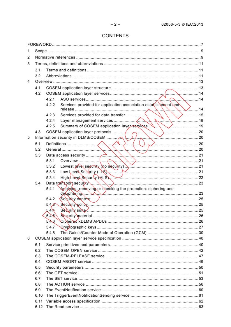 IEC 62056-5-3:2013 is a key international standard published by the International Electrotechnical Commission (IEC) that specifies the DLMS/COSEM application layer for electricity metering data exchange. It defines the structure, services, and protocols for COSEM (Companion Specification for Energy Metering) clients and servers, detailing how to utilize the DLMS (Device Language Message Specification)/COSEM application layer with different communication profiles. This edition supersedes the 2006 version and represents a technical revision that strengthens interoperability and security in smart metering communications.