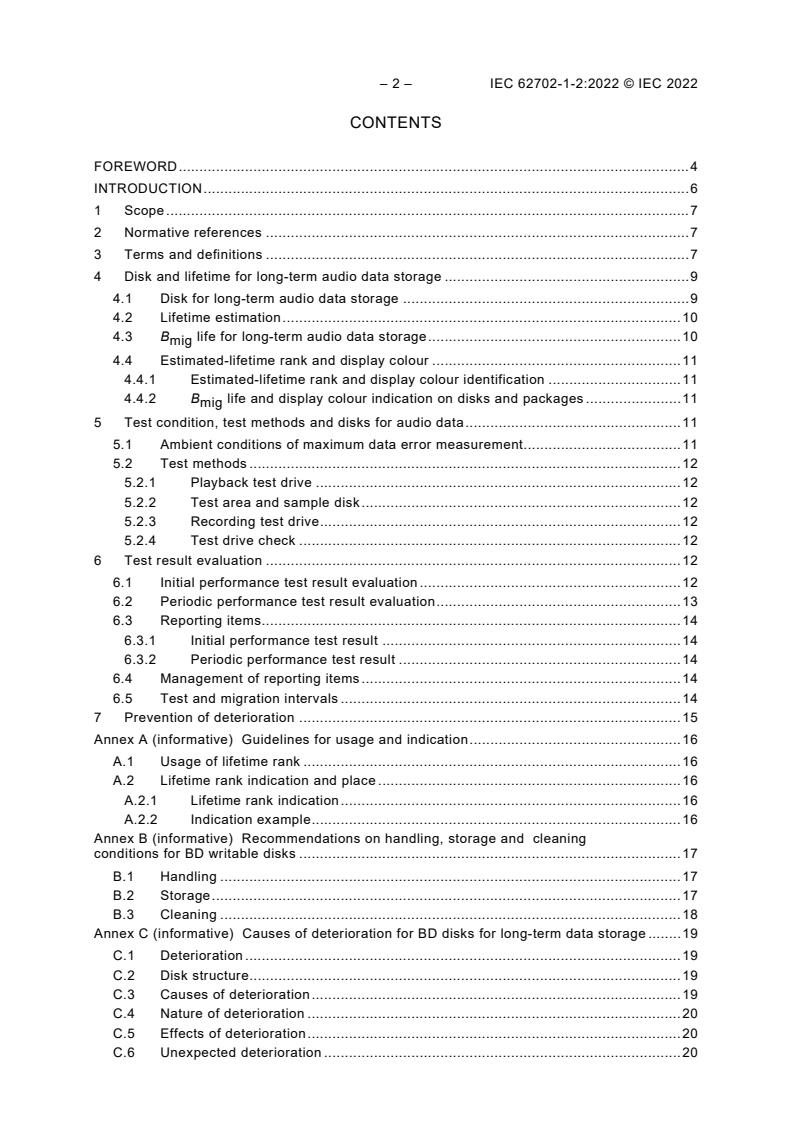 IEC 62702-1-2:2022는 오디오 데이터의 장기 저장을 위한 기록 가능한 BD 디스크에 대한 데이터 품질 보증 및 데이터 이전 방법을 규정하는 표준이다. 이 표준은 오디오 데이터를 오랜 기간 보존하기 위해 디스크에 기록된 데이터를 유지할 수 있는 데이터 이전 방법과 데이터 품질 보증 방법을 명시한다. 기록 가능한 디스크에는 BD 기록 가능 디스크와 BD 재기록 가능 디스크가 포함된다. 이 버전은 2016년에 발표된 첫 번째 판을 취소하고 대체하는 기술 개정판이다. ISO/IEC 29121:2021에 대한 업데이트를 반영하기 위해 이 버전에서는 다음과 같은 중요한 기술적 변경 사항이 포함되어 있다: a) 수명 추정을 위한 판정 시험 방법으로 ISO/IEC 16963이 지정되었다. b) 최대 데이터 오류 측정을 위한 주변 환경 조건이 추가되었다. c) 사용자의 사용 조건을 고려하여 시험 드라이브 요구 사항이 변경되었다. d) 추정 수명에 대한 요구 사항이 더 명확하게 정의되었다. e) 주기적인 성능 테스트에 대한 요구 사항이 더 명확하게 정의되었다.