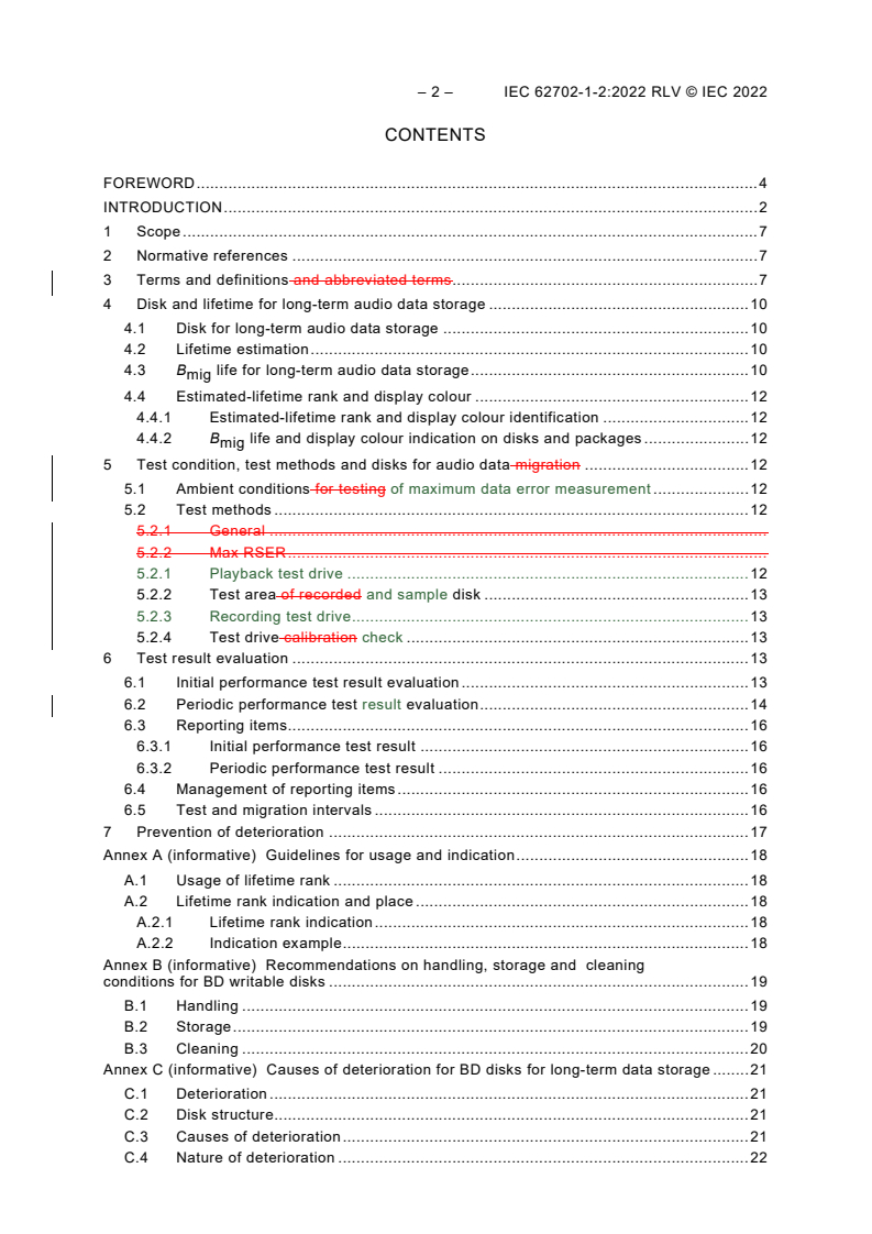 IEC 62702-1-2:2022 is a standard that provides guidelines for ensuring data quality and migration on writable BD disks used for long-term audio data storage. It replaces the previous edition from 2016 and includes several technical revisions. The changes include the adoption of ISO/IEC 16963 as the test method for estimating disk lifetime, the addition of ambient conditions for measuring maximum data error, updates to the requirements for test drives based on user conditions, clearer definitions for estimated disk lifetime requirements, and clearer guidelines for periodic performance testing.