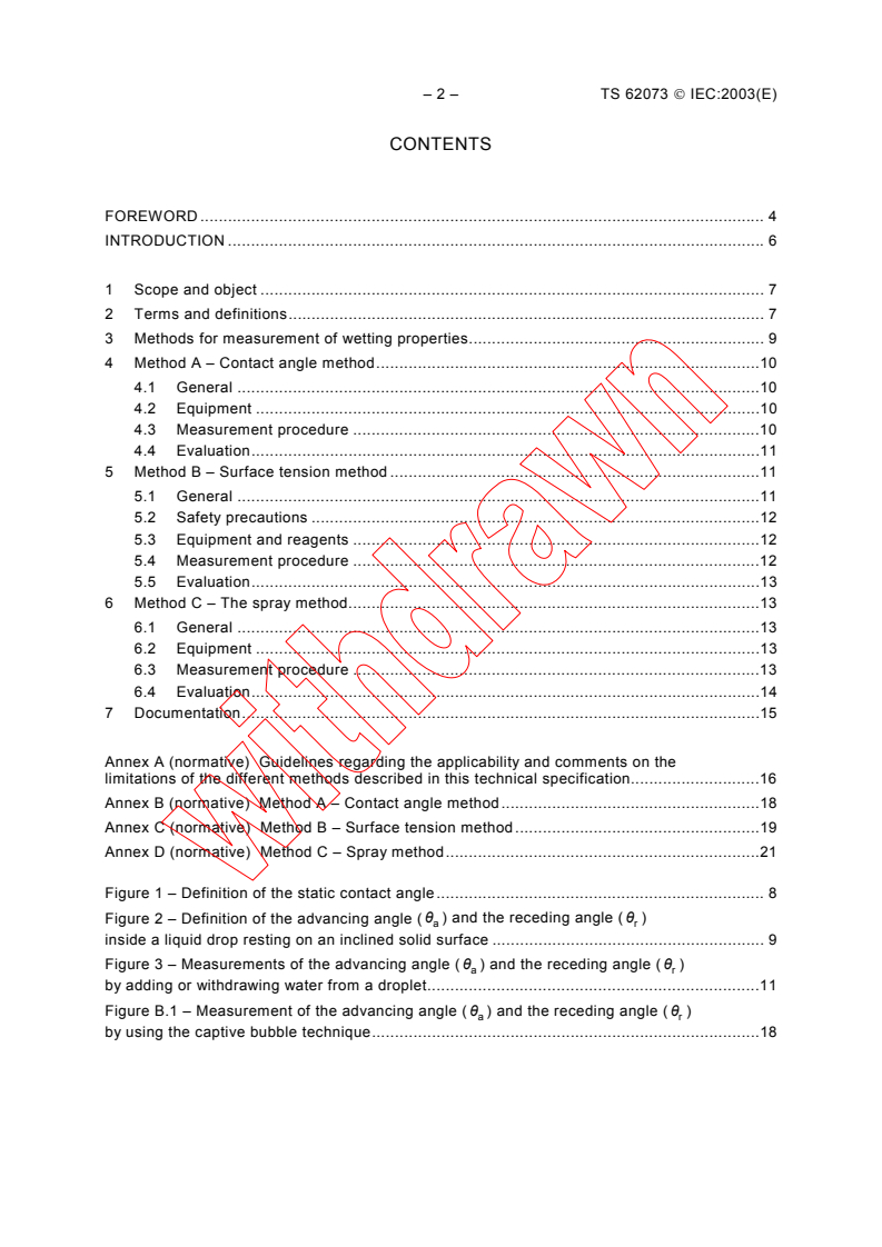 The methods described in this technical specification can be used for the measurement of the wettability of the shed and housing material of composite insulators for overhead lines, substations and equipment or ceramic insulators covered or not covered by a coating. The obtained value represents the wettability at the time of the measurement. The determination of the ability of water to wet the surface of insulators may be useful to evaluate the condition of the surface of insulators in service, or as part of the insulator testing in the laboratory.