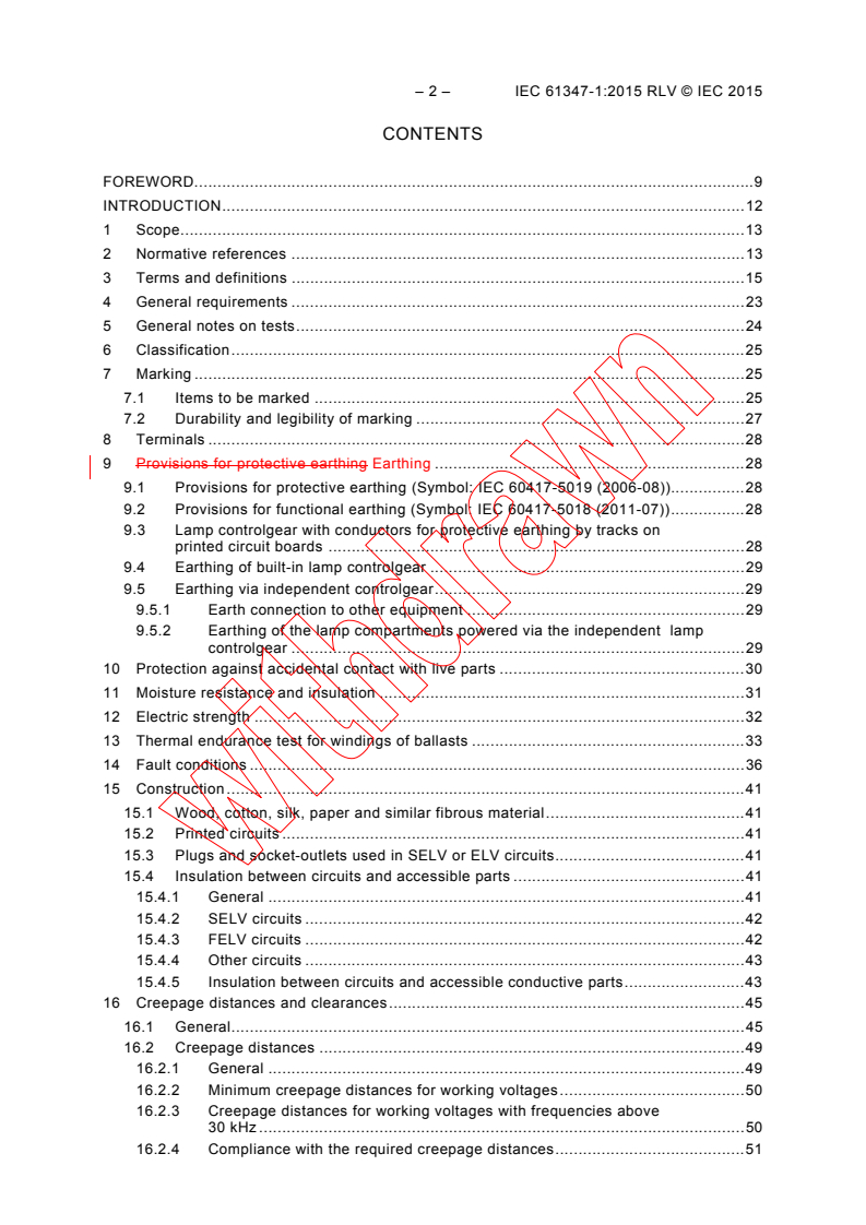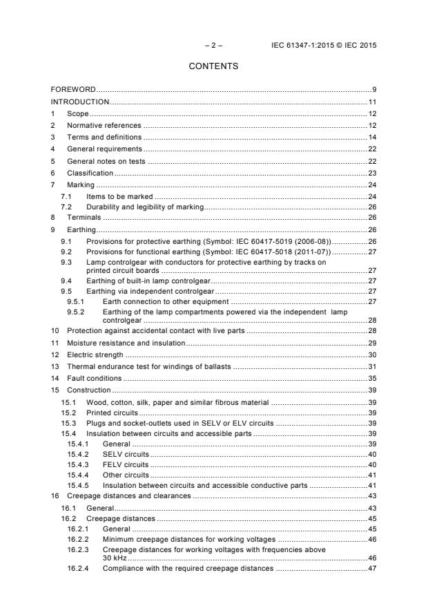 IEC 61347-1:2015 is a standard published by the International Electrotechnical Commission (IEC). Its full title is "Lamp controlgear - Part 1: General and safety requirements". This standard covers: IEC 61347-1:2015 specifies general and safety requirements for lamp controlgear for use on d.c. supplies up to 250 V and/or a.c. supplies up to 1 000 V at 50 Hz or 60 Hz. This third edition cancels and replaces the second edition published in 2007, Amendment 1:2010 and Amendment 2:2012. This edition constitutes a technical revision. This edition includes the following significant technical changes with respect to the previous edition: a) additional marking requirements; b) additional requirements for creepage distances and clearances: - for working voltages with operating frequencies up to 30 kHz; - for working voltages with higher operating frequencies than 30 kHz; - for impulse and resonance voltages ignition; - for basic, supplementary and reinforced insulation; - for insulation between circuits; - for coated or potted controlgear; c) modification of definition of ELV and FELV; d) modification of schematic drawing, showing the different controlgear classification and insulation requirements; e) scope extension; f) new Annex A: test to establish whether a conductive part is a live part which may cause an electric shock; g) new Annex M: creepage distances and clearances for controlgear where a higher degree of availability (impulse withstand category III) may be requested; h) new Annex Q: example for Up calculation; i) new Annex P: creepage distances and clearances and distance through isolation (DTI) for lamp controlgear which are protected against pollution by the use of coating or potting; j) new Annex R: concept of creepage distances and clearances. This publication is to be read in conjunction with theIEC 61347-2 series