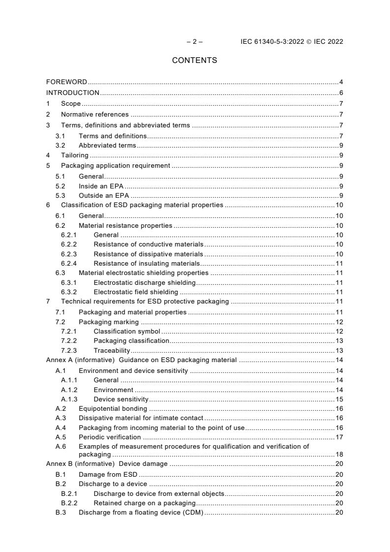 IEC 61340-5-3:2022 defines the ESD protective packaging properties required to protect ESD sensitive devices (ESDSs) through all phases of production, rework and maintenance, transport and storage. Test methods are referenced to evaluate packaging and packaging materials for these product and material properties. Performance limits are provided. This document does not address protection from electromagnetic interference (EMI), electromagnetic pulsing (EMP) or protection of electrically initiated explosive materials or devices. This edition includes the following significant technical changes with respect to the previous edition: a) reference to IEC 61340-4-10 was removed; b) material resistance property "electrostatic field shielding" was removed; c) the requirement for electrostatic discharge shielding was changed from 50 nJ to 20 nJ; d) Table 1 – footnote "b" was changed to mention the two-point probe in IEC 61340-2-3; e) "shall be marked" was changed to "should be marked" in 7.2.2 and 7.2.3; f) Table 3 – the classification symbol and the primary function code F was removed; g) Table A.2 – references to IEC TS 61340-5-4 [2] and IEC TR 61340-5-5 [3] were added; h) Annex C – guidance regarding electric field shielding was added; i) Annex D – low charging material property was added.