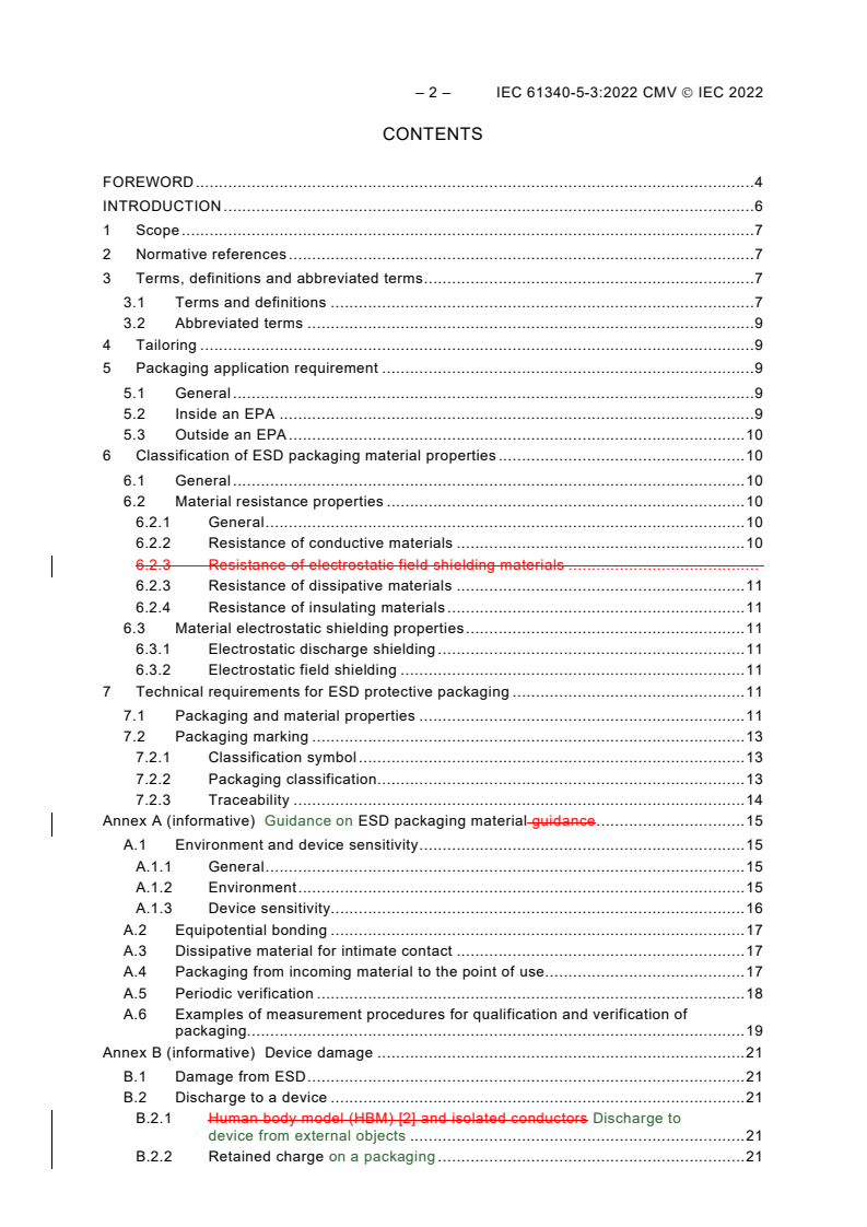REDLINE IEC 61340-5-3:2022 CMV - Electrostatics - Part 5-3: Protection of electronic devices from electrostatic phenomena - Properties and requirements classification for packaging intended for electrostatic discharge sensitive devices Released:4/27/2022 Isbn:9782832249628