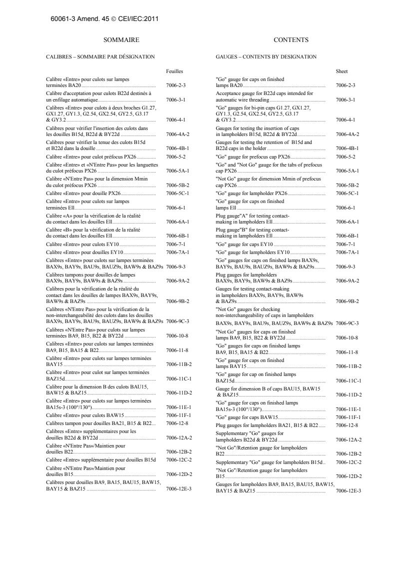 IEC 60061-3:1969/AMD45:2011 Amendment 45 delivers enhanced specifications and measurement techniques for gauges used to verify lamp caps and holders, focusing on reliable interchangeability and increased safety. Utilizing these internationally recognized gauges supports manufacturers and certifiers in maintaining high-quality, safe lighting products compatible across global markets. This amendment underscores the IEC’s role in standardizing electrical lighting components and protecting consumers with practical, consistent testing procedures.