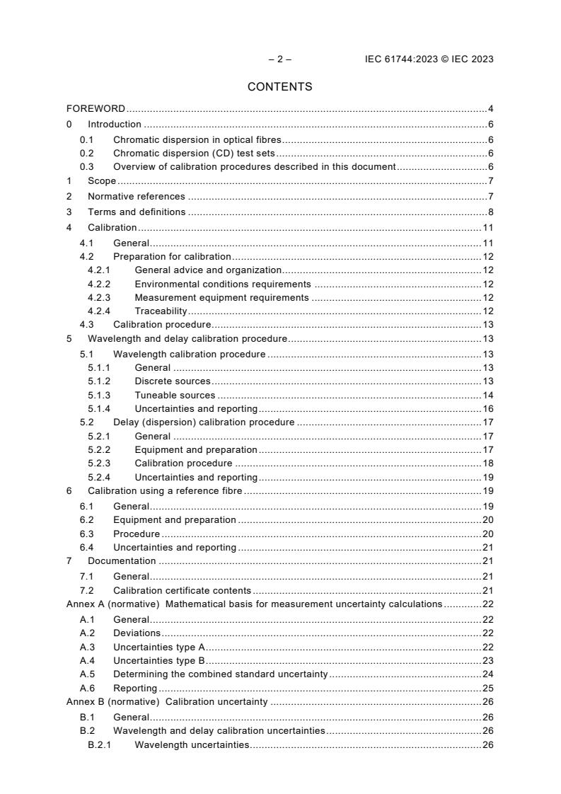 IEC 61744:2023 provides standard procedures for the calibration of optical fibre chromatic dispersion (CD) test sets. This document is applicable to all types of CD test sets, with the exception that measurements on multimode optical fibres are excluded. The purpose of this document is to define a standard procedure for calibrating optical fibre chromatic dispersion (CD) test sets. The detailed calibration steps used vary according to the measurement technique used in the CD test set. Whilst it is acknowledged that chromatic dispersion also occurs in multimode fibre and this fibre can be measured on many CD test sets, this document will restrict discussion to single mode fibre measurements applications only. The purpose of the procedures outlined in this document is to focus manufacturers and users of CD test sets toward the reduction of measurement uncertainty in chromatic dispersion determination in optical fibres under all applicable conditions. The procedures apply to calibration laboratories and to the manufacturers or users of CD test sets for the purpose of a) calibrating CD test sets, and b) evaluating the level of performance of the instrument. Use of the procedures also allows correct evaluation of CD test set uncertainty, relative and traceable to appropriate (for example, national) standards. This third edition cancels and replaces the second edition published in 2005. This edition constitutes a technical revision. This edition includes the following significant technical changes with respect to the previous edition: a) updated terms and definitions; b) the use of a reference fibre standard for calibration is now allowed and at the same level as the other calibration method; c) Annex B was split into a new Annex B (on calibration uncertainty, still normative) and a new Annex C (on uncertainty at operating conditions, informative); d) removed former C.3.4 on interferometric method since this method is no longer supported in IEC 60793-1-42; e) removed Annex D and other references in text to calibration compensation to align with other calibration documents; f) removed Annex E and other references in text to use of air wavelength since it is not used in the fibre domain.