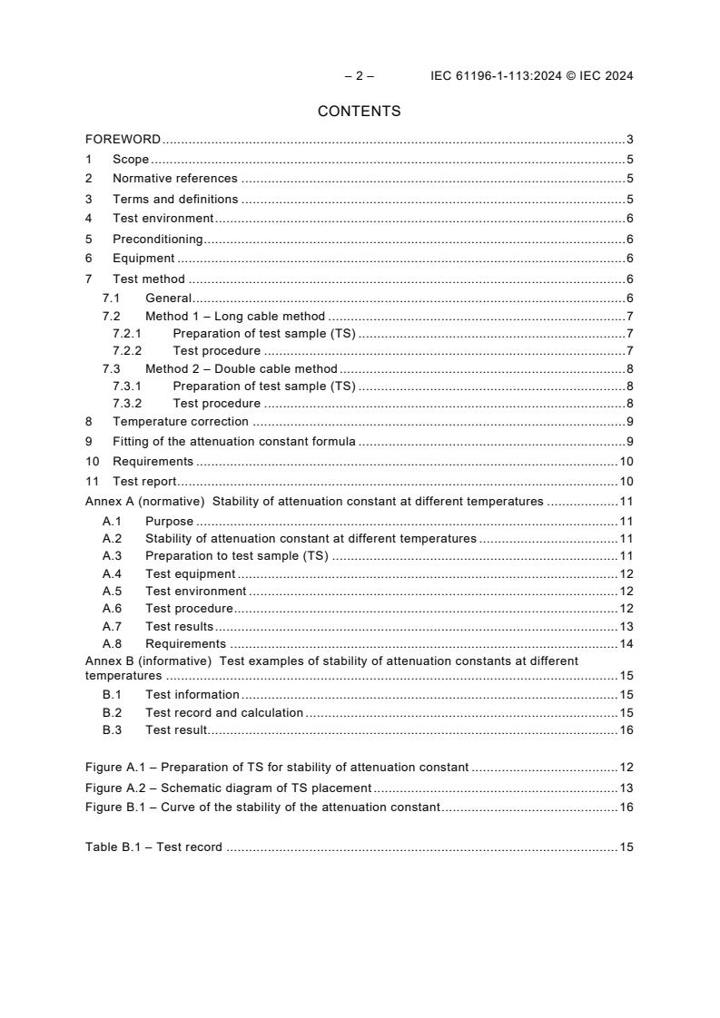 Keywords: IEC 61196-1-113:2024, attenuation constant, coaxial communication cables, test method, vector network analyser, long cable method, double-cable method, temperature stability, preconditioning, test environment.