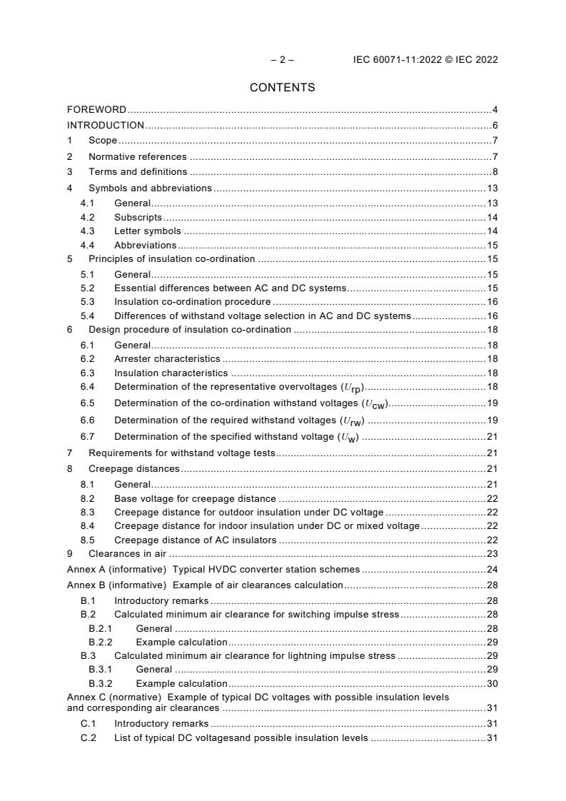 IEC 60071-11:2022 applies to high-voltage direct current (HVDC) systems. It specifies the principles on the procedures for the determination of the specified withstand voltages, creepage distance and air clearances for the equipment and the installations of these systems.