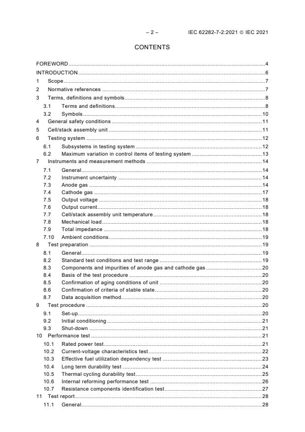 IEC 62282-7-2:2021 applies to SOFC cell/stack assembly units, testing systems, instruments and measuring methods, and specifies test methods to test the performance of SOFC cells and stacks. This document is not applicable to small button cells that are designed for SOFC material testing and provide no practical means of fuel utilization measurement. This document is used based on the recommendation of the entity that provides the cell performance specification or for acquiring data on a cell or stack in order to estimate the performance of a system based on it. Users of this document can selectively execute test items suitable for their purposes from those described in this document. This first edition cancels and replaces IEC TS 62282-7-2 published in 2014. This edition includes the following significant technical changes with respect to IEC TS 622827-2:2014: - users can substitute selected test methods of this document with equivalent test methods of IEC 62282-8-101 for solid oxide cell (SOC) operation for energy storage purposes, operated in reverse or reversible mode; - terms and definitions are aligned with the corresponding terms and definitions in IEC 62282-8-101; - symbols are aligned with the corresponding symbols in IEC 62282-8-101.