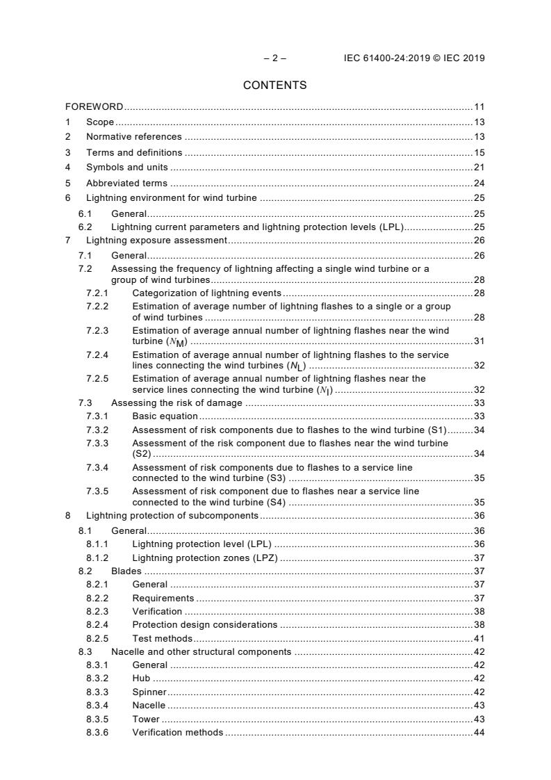 IEC 61400-24:2019 applies to lightning protection of wind turbine generators and wind power systems. Refer to guidelines for small wind turbines in annex. This document defines the lightning environment for wind turbines and risk assessment for wind turbines in that environment. It defines requirements for protection of blades, other structural components and electrical and control systems against both direct and indirect effects of lightning. Test methods to validate compliance are included. Guidance on the use of applicable lightning protection, industrial electrical and EMC standards including earthing is provided. This second edition cancels and replaces the first edition, published in 2010. This edition includes the following significant technical changes with respect to the previous edition: a) it is restructured with a main normative part, while informative information is placed in annexes.
