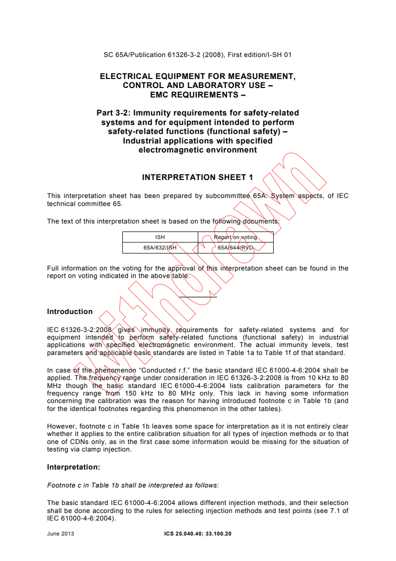 IEC 61326-3-2:2008 is a standard published by the International Electrotechnical Commission (IEC). Its full title is "Electrical equipment for measurement, control and laboratory use - EMC requirements - Part 3-2: Immunity requirements for safety-related systems and for equipment intended to perform safety-related functions (functional safety) - Industrial applications with specified electromagnetic environment". This standard covers: IEC 61326-1 applies to this part of IEC 61326 but is limited to systems and equipment for industrial applications within a specified electromagnetic environment and intended to perform safety functions as defined in IEC 61508 with SIL 1-3. The electromagnetic environments encompassed by this product family standard are industrial, both indoor and outdoor, as they can be found in industrial applications with an electromagnetic environment having specified characteristics (for example, process industry). The difference between the electromagnetic environment covered by this standard compared to the general industrial environment (see IEC 61326-3-1) is due to the mitigation measures employed against electromagnetic phenomena leading to a specified electromagnetic environment. The contents of Interpretation Sheet 1 of June 2013 have been included in this copy.