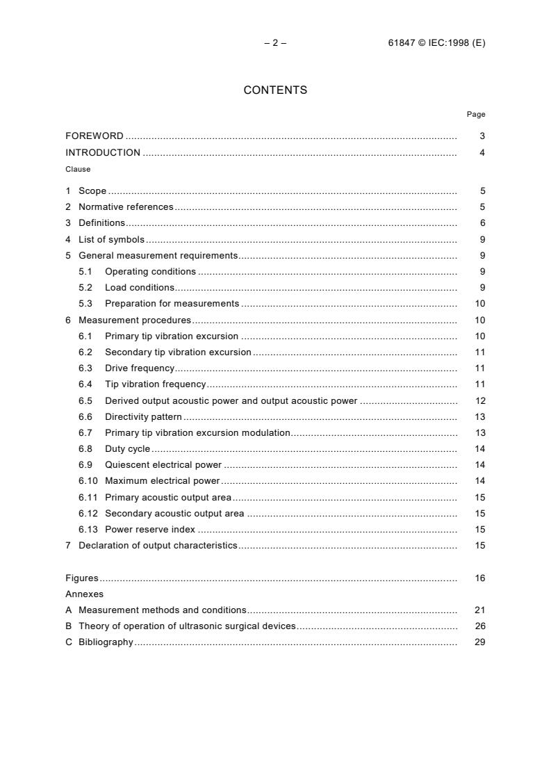 IEC 61847:1998 is a standard published by the International Electrotechnical Commission (IEC). Its full title is "Ultrasonics - Surgical systems - Measurement and declaration of the basic output characteristics". This standard covers: This standard specifies: - the essential non-thermal output characteristics of ultrasonic surgical units; - methods of measurement ot these output characteristics; - those characteristics which should be declared by the manufacturers of such equipment. This standard is applicable to equipment which meets the requirements of a, b and c below: a) ultrasonic surgical systems operating in the frequency range 20 kHz to 60 kHz; and b) ultrasonic surgical systems, whose use is the fragmentation or cutting of human tissue, whether or not those effects are delivered in conjunction with tissue removal or coagulation; and c) ultrasonic surgical systems, in which an acoustic wave is conducted by means of a specifically designed wave guide to deliver energy to the surgical site.