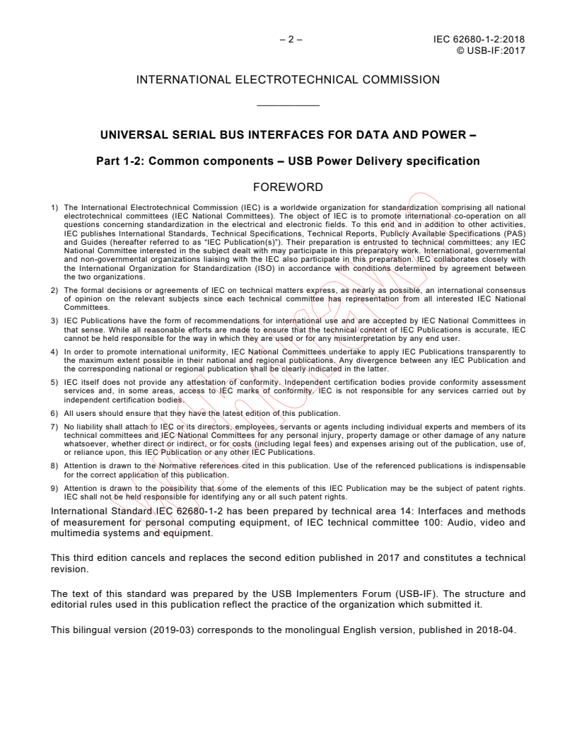 IEC 62680-1-2:2018 - Universal serial bus interfaces for data and power - Part 1-2: Common components - USB Power Delivery specification Released:4/12/2018 Isbn:9782832255810
