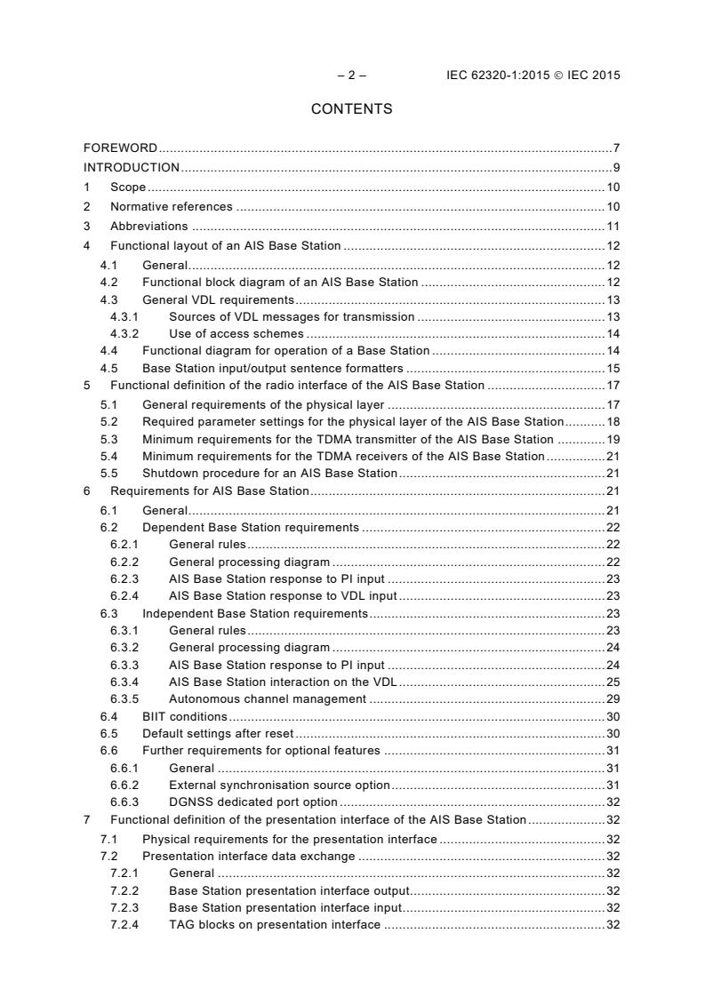 IEC 62320-1:2015 is a standard published by the International Electrotechnical Commission (IEC). Its full title is "Maritime navigation and radiocommunication equipment and systems - Automatic identification system (AIS) - Part 1: AIS Base Stations - Minimum operational and performance requirements, methods of testing and required test results". This standard covers: IEC 62320-1:2015 specifies the minimum operational and performance requirements, methods of testing and required test results for AIS Base Stations, compatible with the performance standards adopted by IMO Resolution MSC.74 (69), Annex 3, Universal AIS. It incorporates the technical characteristics of non-shipborne, fixed station AIS equipment, included in recommendation ITU-R M.1371 and IALA Recommendation A-124. Where applicable, it also takes into account the ITU Radio Regulations. This standard takes into account other associated IEC international standards and existing national standards, as applicable. This standard is applicable for AIS Base Stations. It does not include specifications for the display of AIS data on shore. This second edition cancels and replaces the first edition published in 2007 and its Amendment 1:2008. This edition constitutes a technical revision. This edition includes the following significant technical changes with respect to the previous edition: - incorporation of the technical characteristics included in Recommendation ITU R M.1371 5; - the BCE, BCF and CAB sentences replaced with BCG, BCL and RST; - comment blocks replaced with TAG blocks; - scheduled broadcast of Message 26 added; - Message 27 control added; - transmitter intermodulation attenuation harmonised with ITU; - 12,5 kHz channel operation removed; - transmission of Message 24A, Message 25 and Message 26 added; - 90 % channel load test with VSI and TAG blocks enabled added.