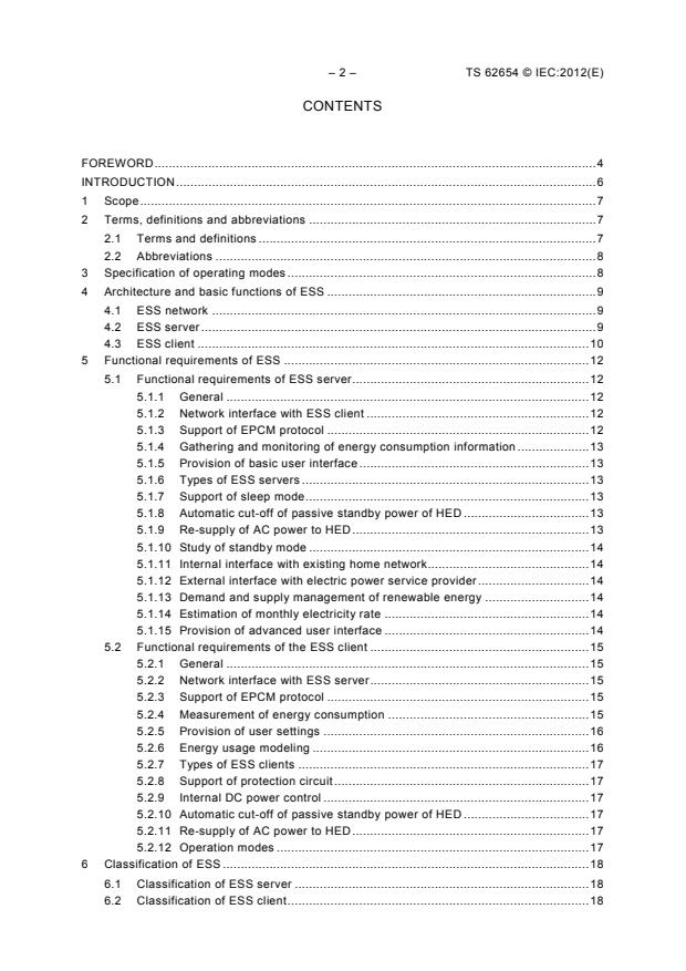 IEC/TS 62654:2012(E) defines the architecture and functional requirements of an energy saving system (ESS) that measures energy consumption of each home appliance, including AV multimedia equipment and systems, and shows how to reduce its standby power. With respect to energy consumption measurements, this specification extends only to AC power environments in premises.