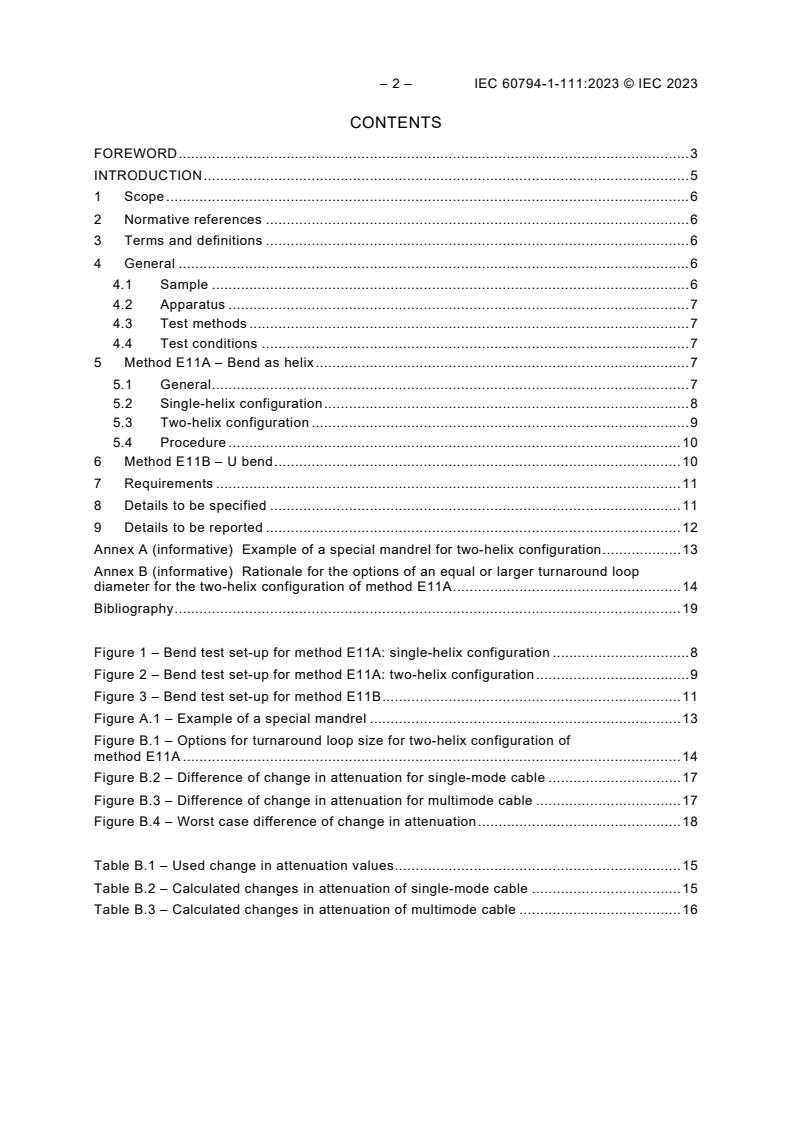 IEC 60794-1-111: 2023 defines the test procedure to determine the ability of an optical fibre cable to withstand bending around a test mandrel. The primary purpose of this procedure is to measure the change in attenuation when the cable is bent around a test mandrel. A secondary purpose is to assess whether the cable has been physically damaged by bending. NOTE 1 This test can be utilized at any specified temperature, including the low or high temperature limits for the cable. NOTE 2 The bend test procedure for cable elements is specified in IEC 60794-1-301, method G1. This document partially cancels and replaces IEC 60794-1-21:2015. This edition constitutes a technical revision. This edition includes the following significant technical changes with respect to IEC 60794‑1‑21:2015: a) the nominal sample length was newly specified as 10 m between the cable element fixing points at both ends, unless otherwise specified; b) the number of turns on the mandrel in Figure 1 for the single-helix configuration were corrected to match the number of turns shown in the figure for the two-helix configuration; c) requirements on the turnaround loop were added for method E11A, two-helix configuration; d) the turnaround loop with the same diameter as the mandrel was taken into account for calculation of the number of turns of each helix for method E11A, two-helix configuration; e) added a formula for calculation of the number of revolutions in each helix for method E11A, two-helix configuration; f) added a description for the procedure when the turnaround loop diameter is larger than the mandrel diameter for method E11A, two-helix configuration; g) all the figures were updated and the different components labelled; h) added the attenuation monitoring equipment in 4.2 for the apparatus and the description to measure the change in attenuation in the test methods E11A and E11B; i) added Clause 9 for details to be reported; j) added Annex A showing an example of a special mandrel to perform the bend test according to method E11A, two-helix configuration; k) added Annex B providing the rationale for the options of method E11A, two-helix configuration.