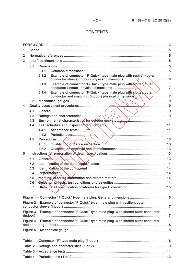 IEC 61169-47:2012 is a sectional specification within the IEC 61169 series that defines rules and recommended performance characteristics for radio-frequency coaxial connectors with clamp (push‑on) coupling, typically the type F-Quick used in 75 Ω cable networks. Rather than being a product specification, this standard guides the preparation of Detail Specifications (DS) by describing interface dimensions, gauging, electrical and mechanical performance, test schedules and inspection requirements for F‑Quick connectors.