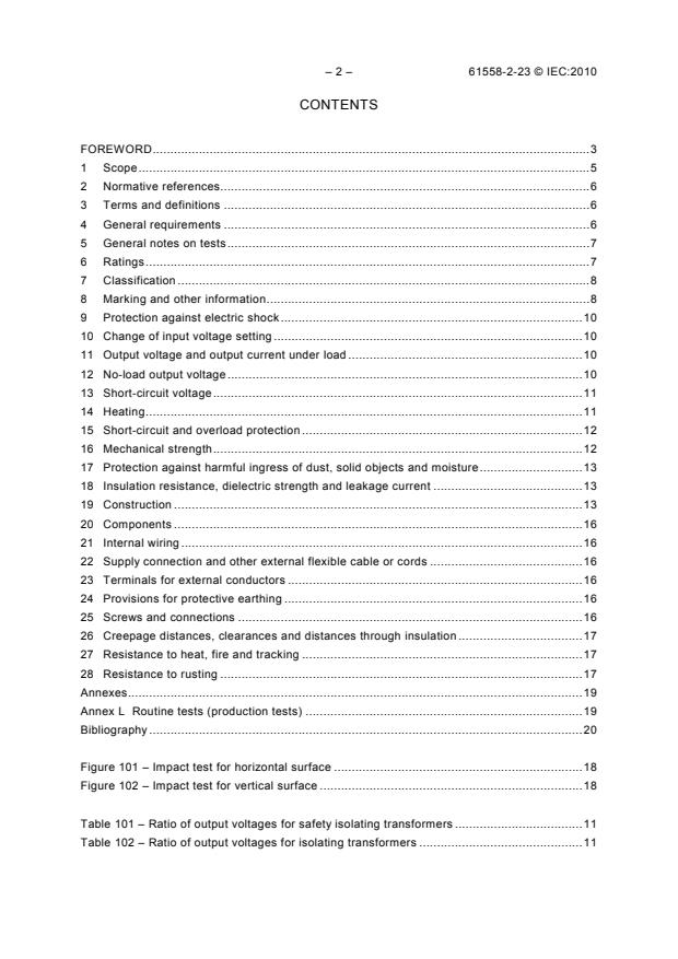 IEC 61558-2-23:2010 is a standard published by the International Electrotechnical Commission (IEC). Its full title is "Safety of transformers, reactors, power supply units and combinations thereof - Part 2-23: Particular requirements and tests for transformers and power supply units for construction sites". This standard covers: IEC 61558-2-23:2010 deals with the safety of transformers for construction sites and power supply units incorporating transformers for construction sites. Transformers incorporating electronic circuits are also covered by this standard. This second edition cancels and replaces the first edition published in 2000. It constitutes a technical revision. The main changes consist of updating this Part 2-23 in accordance with IEC 61558-1:2005. This part has the status of a group safety publication in accordance with IEC Guide 104: The preparation of safety publications and the use of basic safety publications and group safety publications. The attention of National Committees is drawn to the fact that equipment manufacturers and testing organizations may need a transitional period following publication of a new, amended or revised IEC publication in which to make products in accordance with the new requirements and to equip themselves for conducting new or revised tests. It is the recommendation of the committee that the content of this publication be adopted for implementation nationally not earlier than 12 months from the date of publication. In the meantime, the previous edition can still be ordered by contacting your local IEC member National Committee or the IEC Central Office.