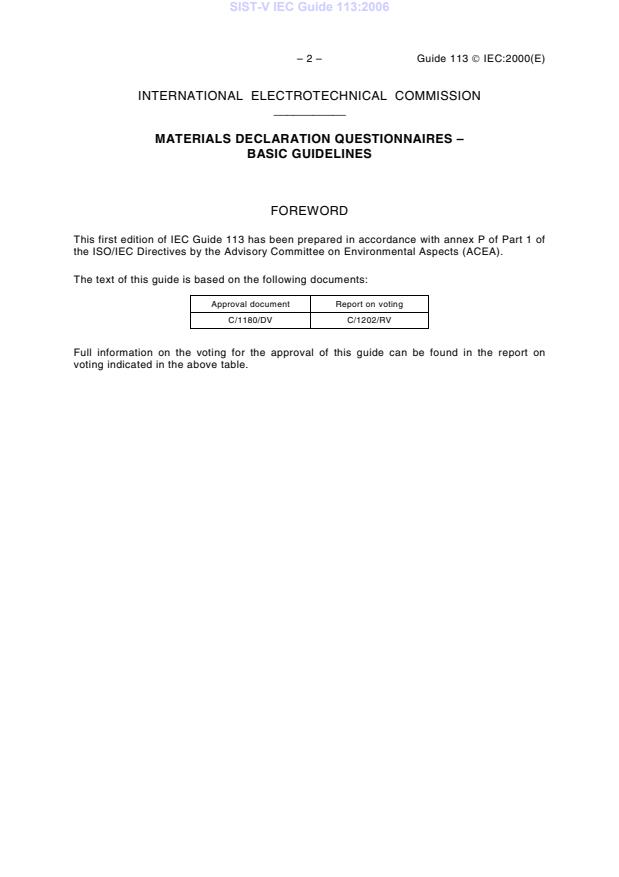 IEC GUIDE 113 is a guide published by the International Electrotechnical Commission (IEC). Its full title is "Materials declaration questionnaires - Basic guidelines". This standard covers: One important aspect of product-related environmental protection is environmentally safe product recycling or disposal. This is possible only with the knowledge of the substances contained and the potential hazards to health and to the environment that they represent. Therefore, the manufacturer should know which environmentally relevant substances are contained in his products. Additionally, he should know the distribution and the concentrations of these substances. He should be able to give the required information to those who need it.[<BR>]This guideline is written to assist companies which have to develop materials declaration questionnaires for products, for instance as part of purchase specifications. It intends to increase the harmonization and the comparability of the various questionnaires.