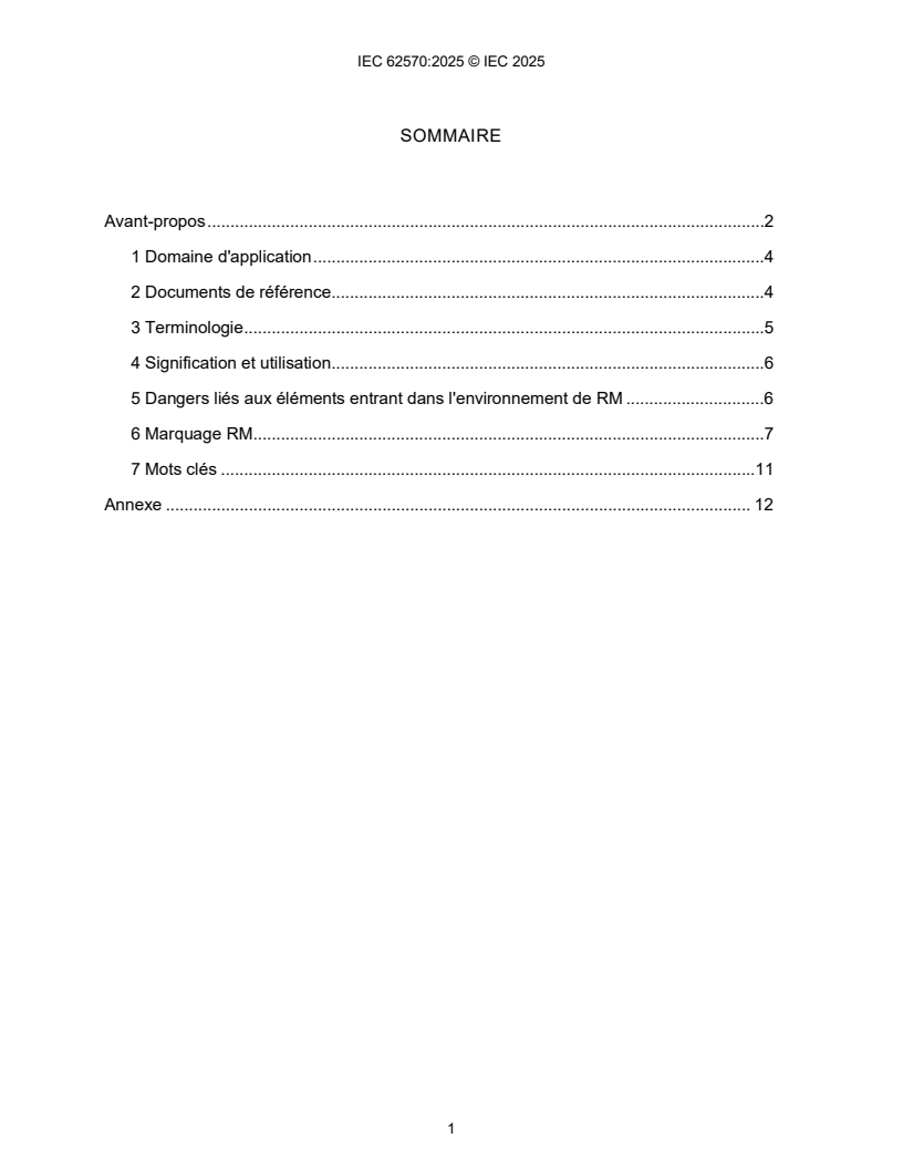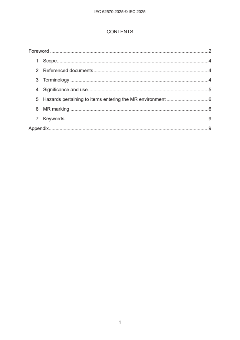 IEC 62570:2025 is a standard published by the International Electrotechnical Commission (IEC). Its full title is "Standard practice for marking medical devices and other items for safety in the magnetic resonance environment". This standard covers: IEC 62570:2025 applies to medical devices and other items that are anticipated to enter the magnetic resonance (MR) environment. This document specifies the marking of items anticipated to enter the MR environment by means of terms and icons, and recommends information that should be included in the labeling. MR image artifacts are not in the scope of the mandatory portions of this practice because they do not present a direct safety issue resulting from specific characteristics of the MR examination.