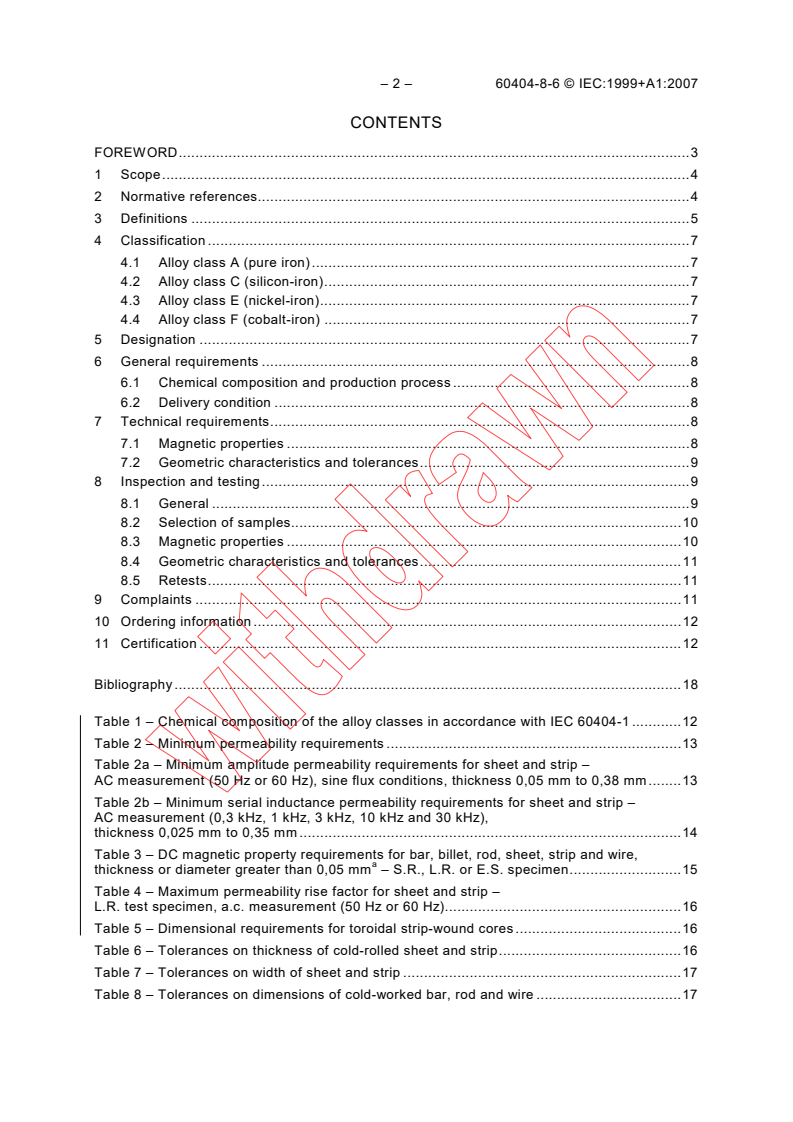 IEC 60404-8-6:1999 is a standard published by the International Electrotechnical Commission (IEC). Its full title is "Magnetic materials - Part 8-6: Specifications for individual materials - Soft magnetic metallic materials". This standard covers: Specifies the general requirements, magnetic properties, geometric characteristics and tolerances as well as inspection procedures for pure iron, silicon-iron, nickel-iron and cobalt-iron. The materials are in the form of bar, billet, sheet, strip or wire. The alloys covered correspond to those defined by classes A, C1, C2, E1 to E4 and F1 to F3 in IEC 60404-1.