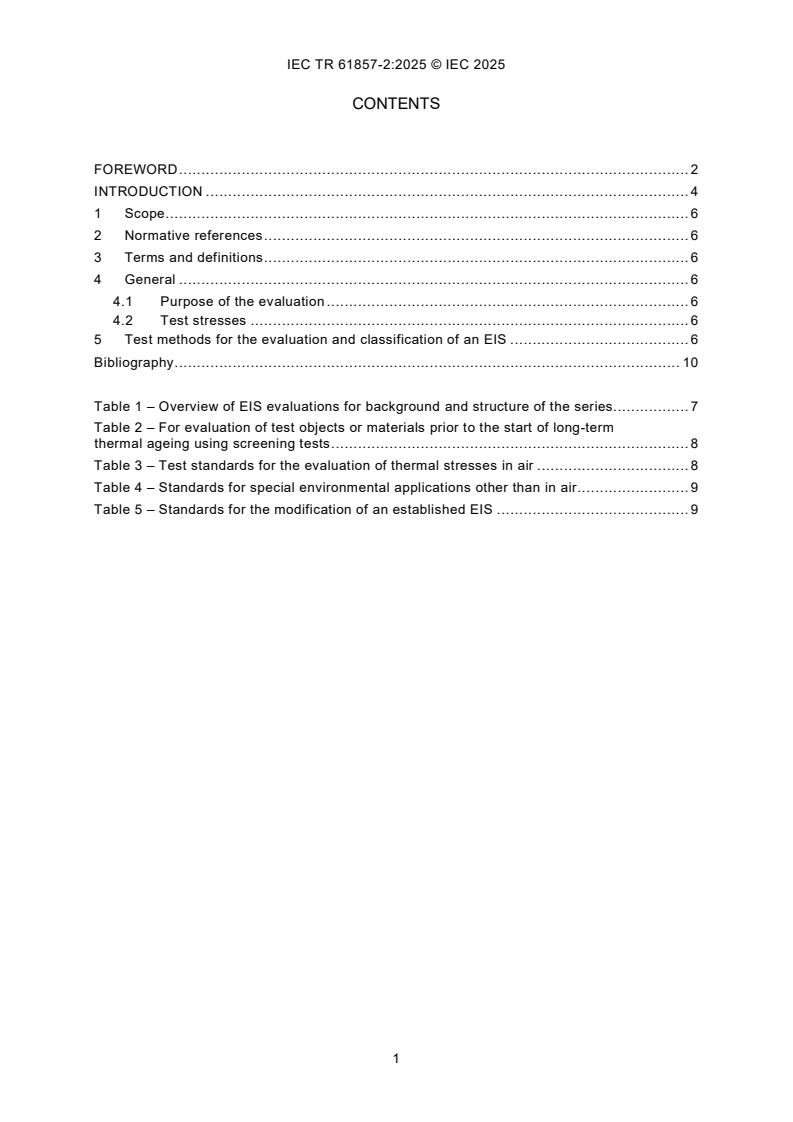 IEC TR 61857-2:2025 is a technical report published by the International Electrotechnical Commission (IEC). Its full title is "Electrical insulation systems – Procedures for thermal evaluation – Part 2: Selection of the appropriate test method for evaluation and classification of electrical insulation systems". This standard covers: IEC TR 61857-2:2025 gives guidelines to identify the appropriate test method for the evaluation of a proposed electrical insulation system (EIS). Some of the standards evaluate the EIS using one stress factor which is thermal. Other standards evaluate the thermal stress factor with adjustments to the conditioning applied prior to the diagnostic testing to simulate applications in air. A third group of these standards when the application is other than in air. This technical report is applicable to existing or proposed EIS used in electrotechnical products across a wide range of operating voltages of IEC Standards. The report takes care to identify the appropriate standard based on construction and intended operating application. For all performance and safety requirements related to an application, refer to the technical committee requirements for the application. This edition includes the following significant technical changes with respect to the previous edition. a) The Introduction is expanded to convey that both TC 112 and TC 2 have established EIS test standards. b) Clause 4 introduces the fact that there are four stress factors, not only thermal. This essential concept carries over into part of Clause 5. c) The large number of established standards are organized into common concept groups in Tables 1 to 5: 1) Table 1 covers an overview of EIS evaluations for background and structure. 2) Table 2 covers evaluation of test objects prior to the start of long-term thermal ageing using screening tests. 3) Table 3 covers test standards for the evaluation of thermal stresses in air and has an increased number of standards. 4) Table 4 covers standards for special environmental applications other than in air 5) Table 5 covers standards for the modification of an established EIS.