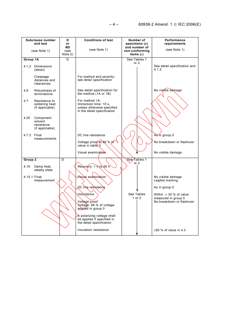 - Grouped tests covering dimensions, visual inspection, DC line resistance, inductance tolerance, voltage proof, insulation resistance, climatic and mechanical stress (damp heat, thermal rise, endurance, vibration, shock), impulse and endurance voltages, and passive flammability where applicable.