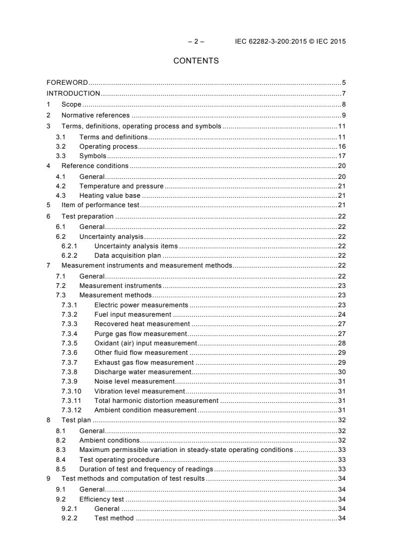 IEC 62282-3-200:2015 is an international standard published by the International Electrotechnical Commission (IEC) that defines performance test methods for stationary fuel cell power systems. This standard specifically addresses operational, electrical, thermal, and environmental aspects of fuel cell technologies used in stationary power generation. The document provides detailed methodologies for assessing the power output, efficiency, response characteristics, emissions, noise, and other environmental parameters of fuel cell systems under controlled test conditions.