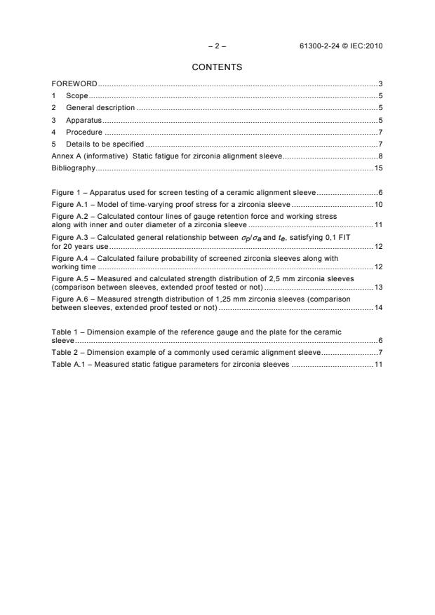IEC 61300-2-24:2010 is part of the IEC 61300 series for fibre optic interconnecting devices and passive components. This second edition defines a screen testing method for ceramic alignment split sleeves (commonly zirconia) by applying a proof stress to reveal manufacturing weaknesses that could cause early failure. The standard includes apparatus descriptions, a step-by-step test procedure, example dimensions for reference gauges and plates, and an informative annex on static fatigue and reliability prediction.