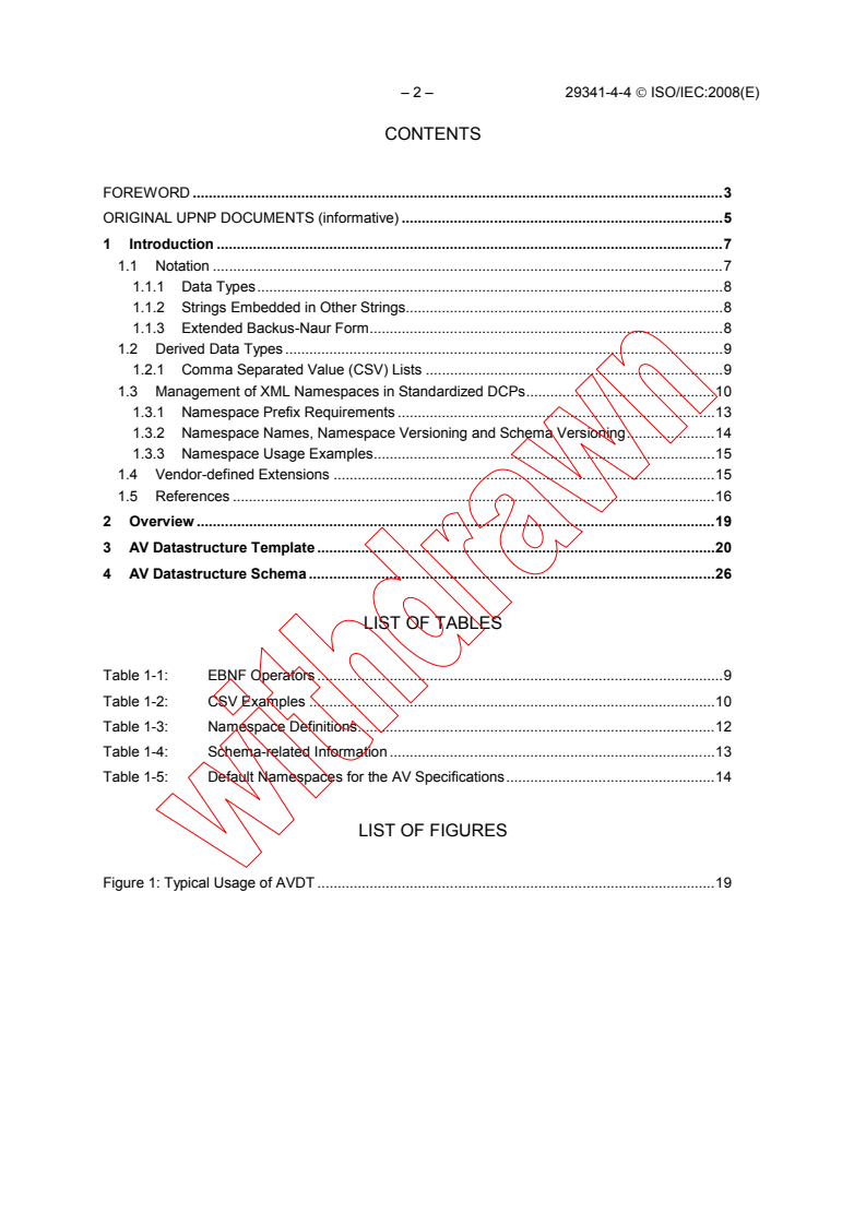 Ingrid Glavich Ingrid Glavich 2 2 1995-11-10T13:27:00Z 2008-11-17T14:58:00Z 2008-11-17T14:58:00Z 1 88 506 4 1 593 10.6845 21 0 0 MicrosoftInternetExplorer4 /* Style Definitions */ table.MsoNormalTable {mso-style-name:"Table Normal"; mso-tstyle-rowband-size:0; mso-tstyle-colband-size:0; mso-style-noshow:yes; mso-style-parent:""; mso-padding-alt:0cm 5.4pt 0cm 5.4pt; mso-para-margin:0cm; mso-para-margin-bottom:.0001pt; mso-pagination:widow-orphan; font-size:10.0pt; font-family:"Times New Roman";} ISO/IEC 29341-4-4:2008(E) defines the layout of the AV Data structure template (AVDT) XML document. An AVDT document describes the format requirements and restrictions of various data structures used within the UPnP AV specifications. The series of ISO/IEC 29341 publications defines an architecture for pervasive peer-to-peer network connectivity of intelligent appliances, wireless devices and PCs. It is designed to bring easy to use, flexible, standards-based connectivity to ad-hoc or unmanaged networks whether in the home, in a small business, public spaces or attached to the Internet.