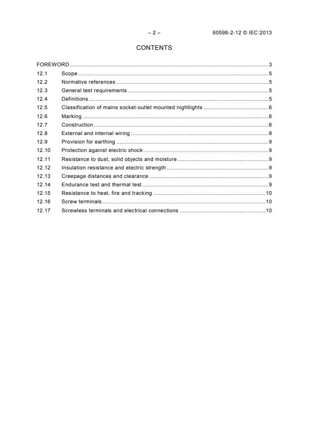 IEC 60598-2-12:2013 specifies requirements for mains socket-outlet mounted nightlights for use with electric light sources, on supply voltages not exceeding 250 V a.c. 50/60 Hz. This second edition cancels and replaces the first edition published in 2006. It constitutes a technical revision for harmonization of thermal tests in 12.13 to relevant parts of 10.12.1 of IEC 60598-2-10.