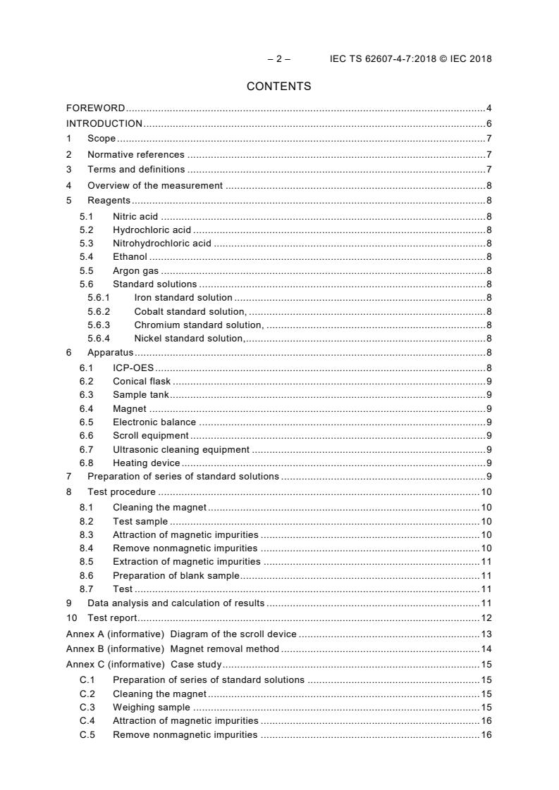 IEC TS 62607-4-7:2018 applies to the determination of the total content of magnetic impurities (iron, cobalt, chromium, and nickel) ≥ 0,02 mg/kg which can be attracted by magnet.