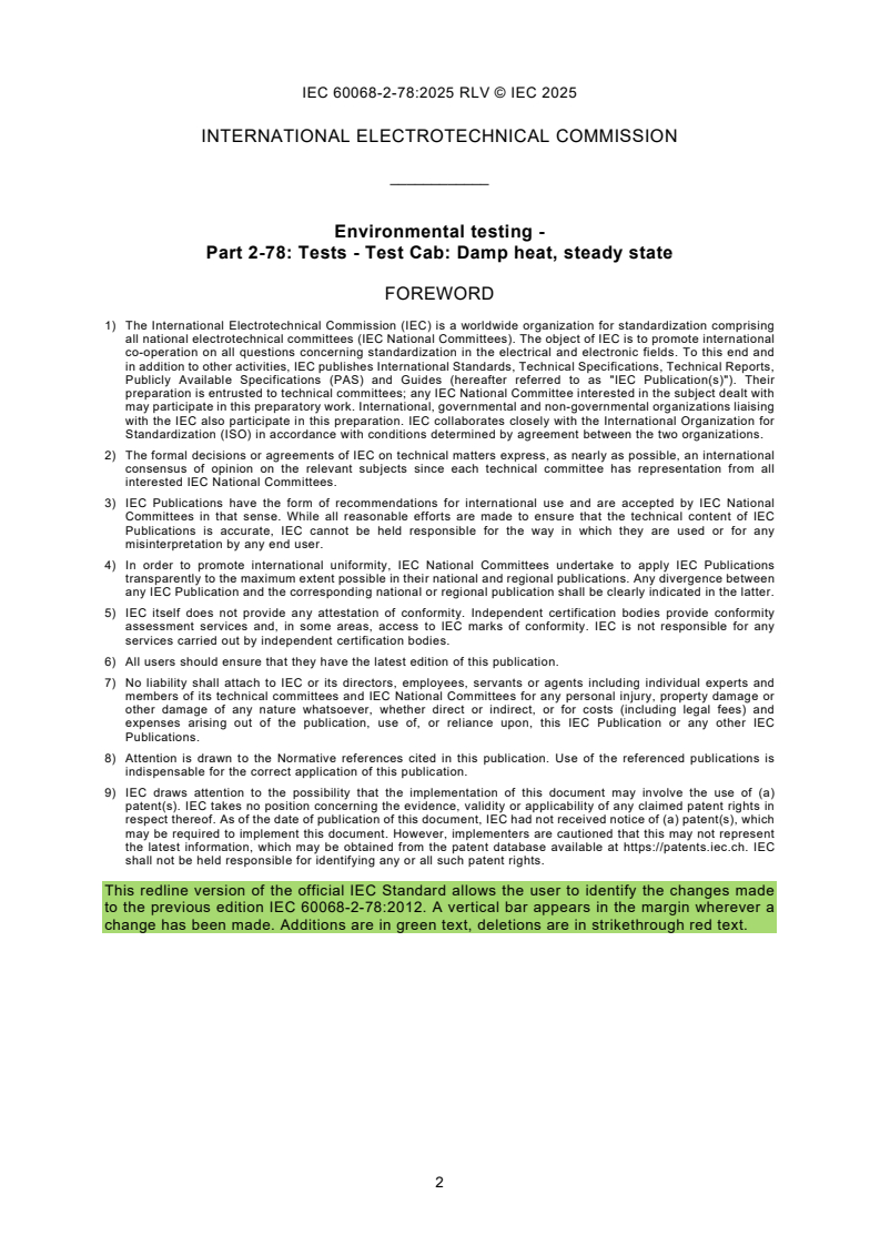IEC 60068-2-78:2025 establishes a test method for determining the ability of components or equipment to withstand transportation, storage and use under conditions of high humidity. The object of this document is to investigate the effect of high humidity at constant temperature without condensation on a specimen over a specified period. It is applicable to small equipment or components as well as large equipment and can be applied to both heat-dissipating and non-heat-dissipating specimens. This third edition cancels and replaces the second edition published in 2012. This edition constitutes a technical revision. This edition includes the following significant technical changes with respect to the previous edition: a) revision of the requirements for the test chamber; b) revision of the severities and including the dew point temperatures; c) change of the temperature tolerances of the test to limits; d) inclusion of a specified preconditioning procedure; e) inclusion of a new figure for clarification purposes; f) revision of standardized requirements for the test report.