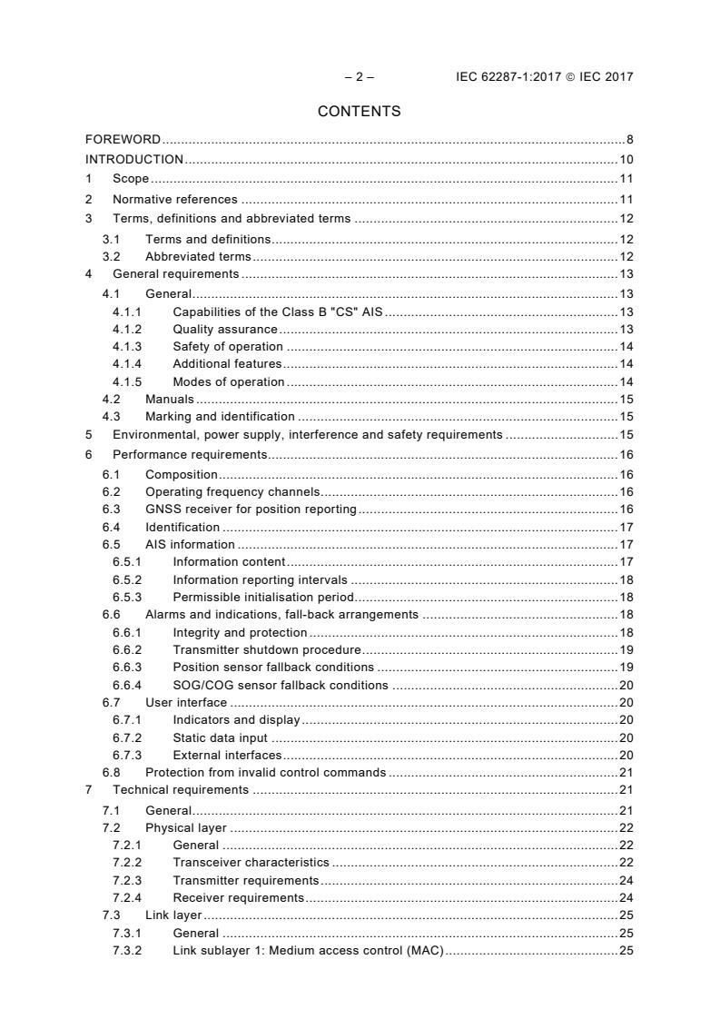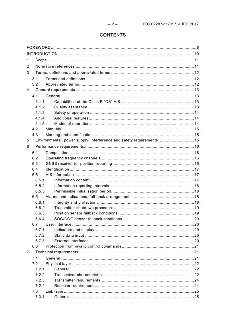 IEC 62287-1:2017 is a standard published by the International Electrotechnical Commission (IEC). Its full title is "Maritime navigation and radiocommunication equipment and systems - Class B shipborne equiment of the automatic identification system (AIS) - Part 1: Carrier-sense time division multiple access (CSTDMA) techniques". This standard covers: IEC 62287-1:2017 specifies the minimum operational and performance requirements, methods of testing and required test results for Class B shipborne automatic identification system (AIS) equipment using carrier-sense time division multiple access (CSTDMA) techniques. This document takes into account other associated IEC International Standards and existing national standards, as applicable. It is applicable for AIS equipment used on craft that are not covered by the mandatory carriage requirement of AIS under SOLAS Chapter V. An AIS station intended to operate in receive-only mode is not considered a Class B shipborne mobile AIS station. This edition includes the following significant technical change with respect to the previous edition: in the synchronisation method, addition of a direct method for synchronisation from an internal UTC source.