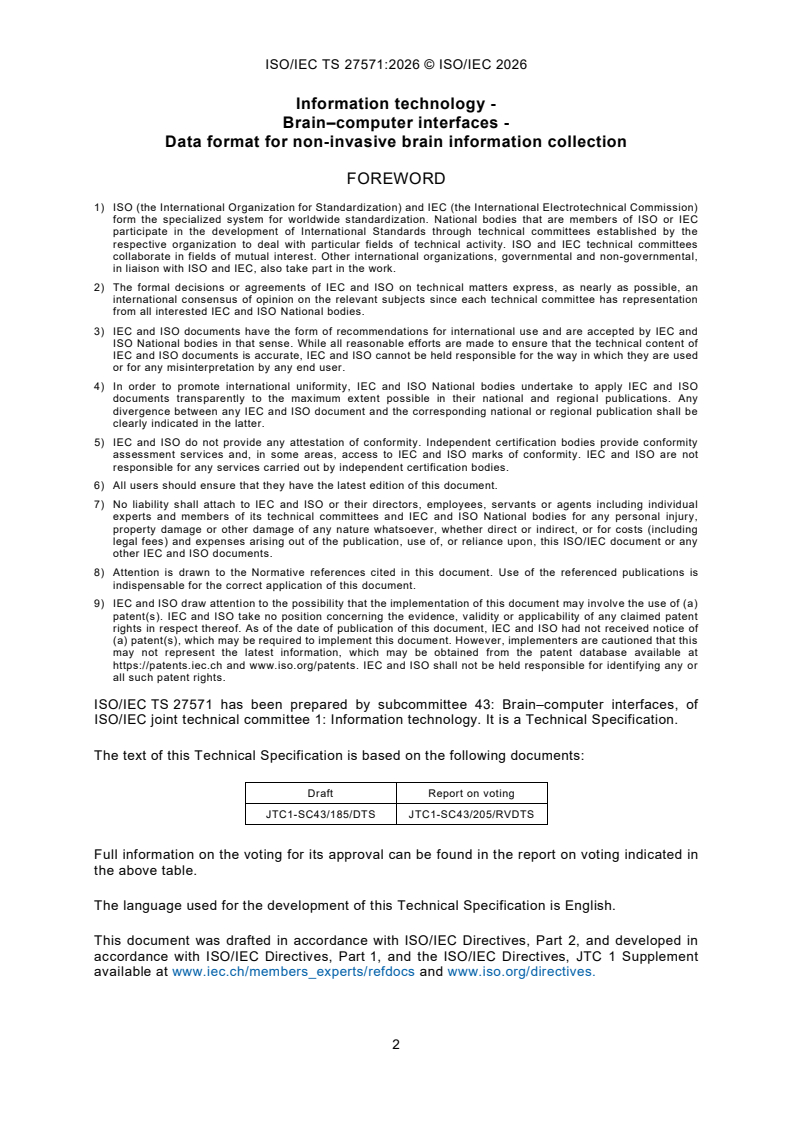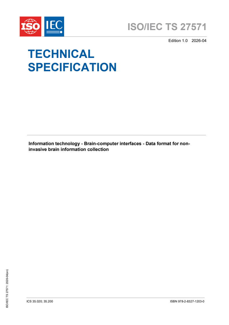 ISO/IEC TS 27571:2026 is a technical specification published by the International Electrotechnical Commission (IEC). Its full title is "Information technology - Brain-computer interfaces - Data format for non-invasive brain information collection". This standard covers: ISO/IEC TS 27571:2026 specifies the basic brain–computer interface (BCI) data format including the definition of basic data elements, technology-specific information and metadata, design of an extensible and modular data structure, specification of metadata and annotation information, and the development of a standardized data format and naming convention for BCI data. This document is applicable to non-invasive BCI technologies, such as electroencephalography (EEG), magnetoencephalography (MEG), functional near-infrared spectroscopy (fNIRS) and functional magnetic resonance imaging (fMRI), and provides a comprehensive approach to BCI metadata formats in the product development environment. It takes into consideration various applications, ranging from neurological rehabilitation to human-computer interaction.