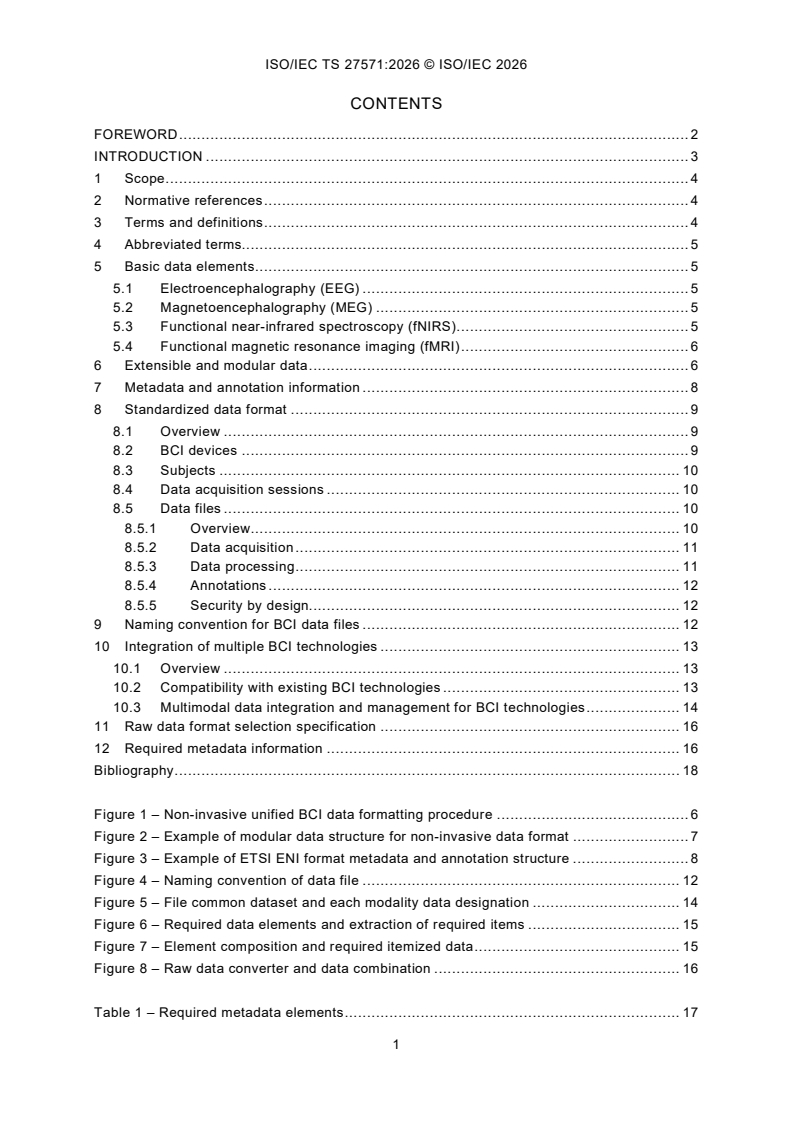 ISO/IEC TS 27571:2026 specifies the basic brain–computer interface (BCI) data format including the definition of basic data elements, technology-specific information and metadata, design of an extensible and modular data structure, specification of metadata and annotation information, and the development of a standardized data format and naming convention for BCI data. This document is applicable to non-invasive BCI technologies, such as electroencephalography (EEG), magnetoencephalography (MEG), functional near-infrared spectroscopy (fNIRS) and functional magnetic resonance imaging (fMRI), and provides a comprehensive approach to BCI metadata formats in the product development environment. It takes into consideration various applications, ranging from neurological rehabilitation to human-computer interaction.
