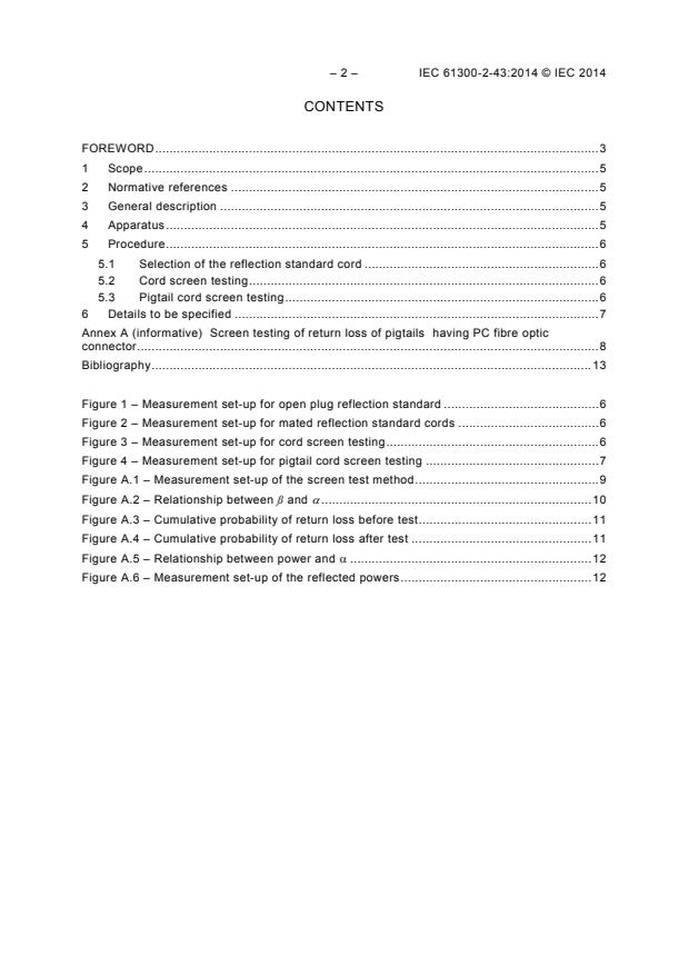 IEC 61300-2-43:2014는 광섬유 케이블이나 광섬유 피그테일의 단일 모드 물리적 접촉(PC) 광섬유 커넥터의 반사손실을 검사하는 것을 목표로 한다. 이렇게 스크린 테스트를 통과한 커넥터들은 현장에서 무작위로 상호 연결되었을 때 최소한의 반사손실을 보장한다. 이 기술 개정판은 1999년에 발행된 초판을 취소하고 대체하며 기술적 개정을 포함한다. 이번 개정판은 이전 버전과 비교하여 다음과 같은 중요한 기술적 변경을 포함한다: - 범위의 개정 - 절차의 개정 - '상세사항에 명시될 사항'에 측정 불확도의 추가 - 참고문헌의 추가 키워드: 단일 모드 물리적 접촉(PC) 광섬유 커넥터, 반사손실