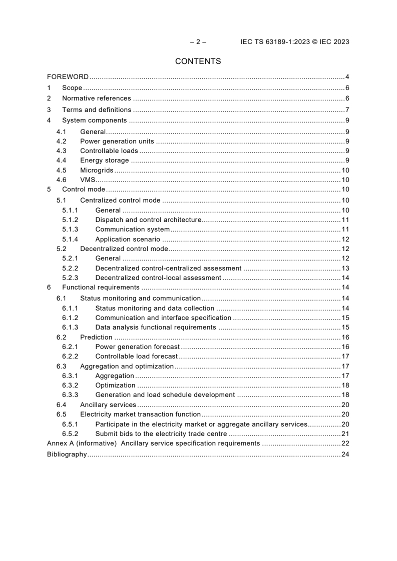 IEC TS 63189-1:2023 is a technical specification published by the International Electrotechnical Commission (IEC). Its full title is "Virtual power plants - Part 1: Architecture and functional requirements". This standard covers: IEC TS 63189-1:2023 covers the terms and definitions, system composition and control modes of virtual power plant (VPP). It defines the functional requirements for VPPs, including power generation forecasting, load forecasting, generation and consumption scheduling, control and management of energy storage devices and loads, coordinated optimization of distributed energy resources, status monitoring and communication, data collection and analysis, and market transactions. Since a virtual power plant is a cluster of dispersed energy converting installations, which are aggregated, it uses additional systems to achieve its objectives (e.g. regional energy meteorology forecasting, site specific energy management systems, SCADA and other communication systems). Local regulations, the electricity market model and the corresponding manner of organising the market related to the utilisation of controllable DER affect the management, control and operation of VPPs.