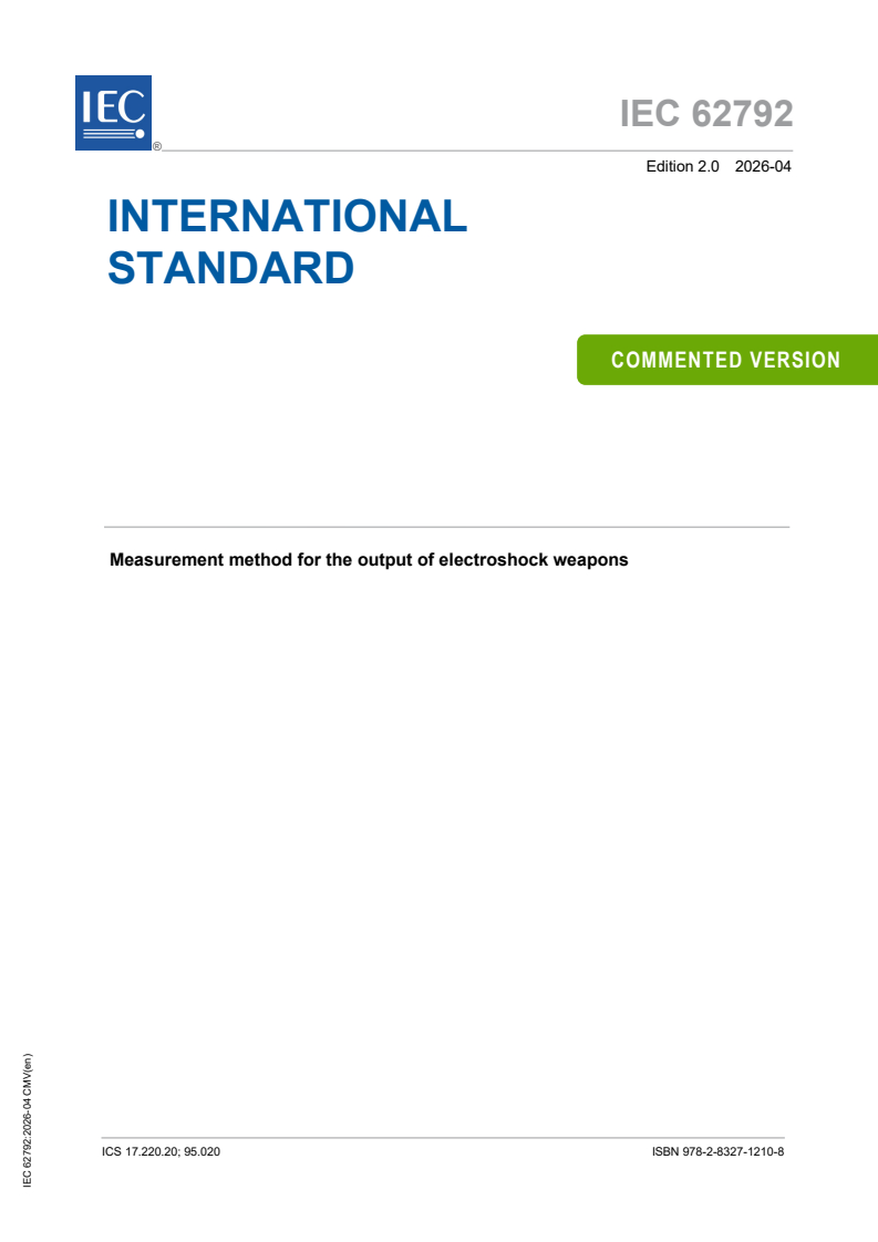 IEC 62792:2026 is a standard published by the International Electrotechnical Commission (IEC). Its full title is "Measurement method for the output of electroshock weapons". This standard covers: IEC 62792:2026 specifies a method for measuring the electrical outputs, current and high voltage, from electroshock weapons (ESWs) that deliver an electrical stimulus to humans. This document is applicable to any and all ESWs.