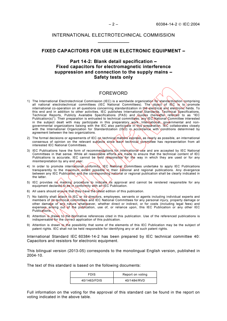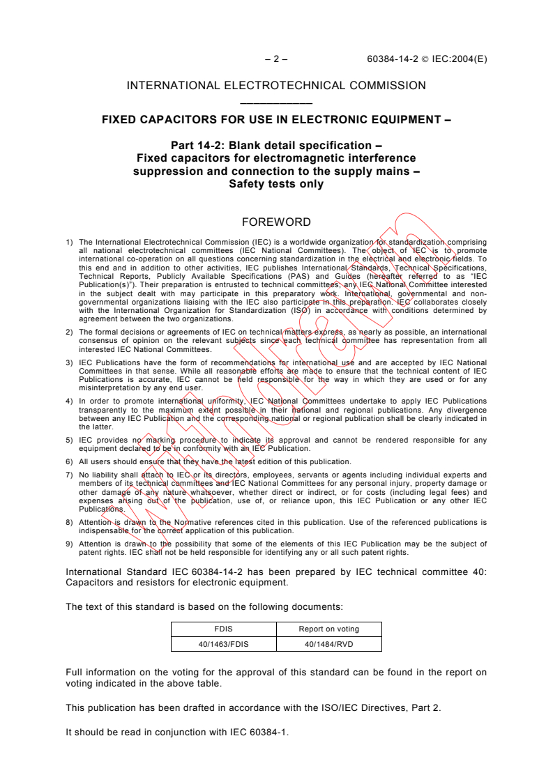 IEC 60384-14-2:2004 is a standard published by the International Electrotechnical Commission (IEC). Its full title is "Fixed capacitors for use in electronic equipment - Part 14-2: Blank detail specification - Fixed capacitors for electromagnetic interference suppression and connection to the supply mains - Safety tests only". This standard covers: IEC 60384-14-2:2004 forms the basis for a uniform procedure for a common International Safety Mark. It implements the approval schedule for safety tests in IEC 60384-14, requires a declaration of design for parameters relevant to safety and prescribes conformance tests to be conducted on every lot prior to its release and requalification tests depending on changes to the declared design. This publication is to be read in conjunction with IEC 60384-1:2008.
