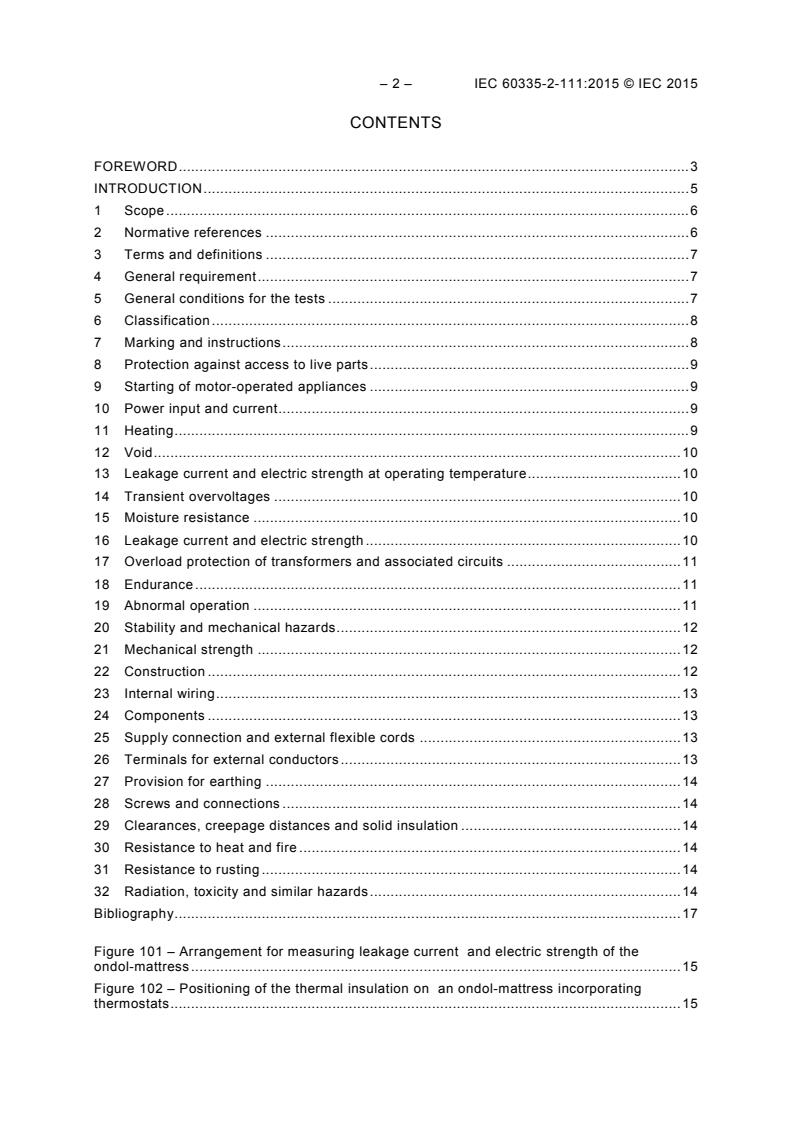 IEC 60335-2-111:2015 deals with the safety of electric ondol-mattresses for household and similar purposes, their rated voltage being not more than 250 V. This standard also applies to control units supplied with the appliance. Appliances not intended for normal household use but which nevertheless may be a source of danger to the public, such as appliances intended to be used in community spas or by persons in cold ambient temperatures, are within the scope of this standard. As far as is practicable, this standard deals with the common hazards presented by appliances that are encountered by all persons in and around the home. However, in general, it does not take into account the use of appliances by young children or infirm persons without supervision or children playing with the appliance. It was established on the basis of the fifth edition (2010) of that standard. The attention of National Committees is drawn to the fact that equipment manufacturers and testing organizations may need a transitional period following publication of a new, amended or revised IEC publication in which to make products in accordance with the new requirements and to equip themselves for conducting new or revised tests. It is the recommendation of the committee that the content of this standard be adopted for implementation nationally not earlier than 12 months or later than 36 months from the date of its publication. Key words: ondol mattress, heating element, non-flexible heated part
