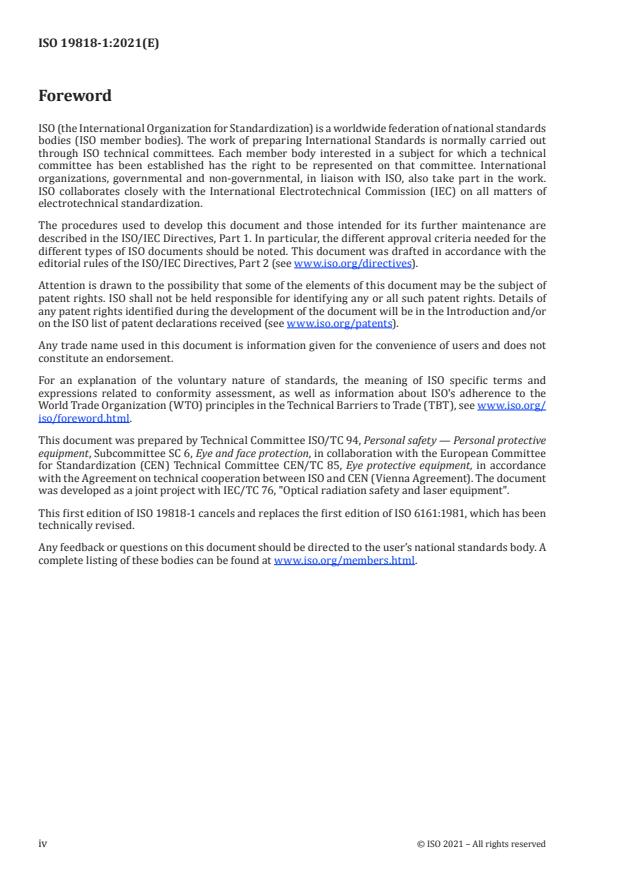 ISO 19818-1:2021 - Eye and face protection - Protection against laser radiation (Part 1: Requirements and test methods) is an international standard developed by ISO in collaboration with IEC. It defines minimum requirements, test methods and marking for personal eye and face protectors intended to prevent accidental exposure to laser radiation in the wavelength range 180 nm to 1 mm. The standard covers protectors used during laser adjustment work and many medical procedures (except periorbital patient treatment, which is covered by ISO/TR 22463). Laser viewing windows and optical instruments for deliberate laser viewing are excluded.