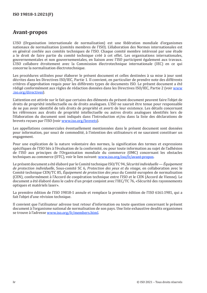 ISO 19818-1:2021 is a standard published by the International Electrotechnical Commission (IEC). Its full title is "Eye and face protection - Protection against laser radiation - Part 1: Requirements and test methods". This standard covers: This document is applicable to protectors intended to provide protection against accidental exposure to laser radiation within the wavelength range 180 nm to 1 mm. It specifies the requirements, test methods and marking. Protectors intended for adjustment work on lasers are included in the scope of this document and are marked in the same way as other protectors, but selection of appropriate eyewear for a specific application is a choice of the user. Laser protective filters used as viewing windows in laser equipment machinery or incorporated into optical instruments such as operating microscopes and loupes that may be used for deliberate viewing of laser radiation as part of their function are outside the scope of this document. Laser radiation in the wavelength range below 180 nm is absorbed in air, therefore eye and face protection should not be required. This document is applicable to devices intended for patient protection during medical laser procedures except for treatment in the periorbital area. Guidance on eye protectors for patients (including those used for periorbital treatment) is given in ISO/TR 22463.