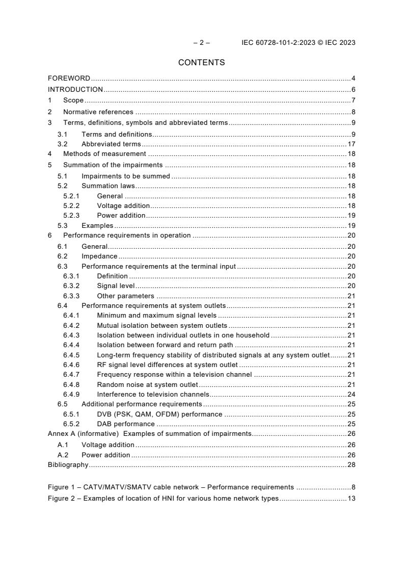 IEC 60728-101-2:2023 is an international standard published by the International Electrotechnical Commission (IEC) that defines the minimum performance requirements for cable networks distributing television signals, sound signals, and interactive services. Specifically, it focuses on the quality of signals delivered at the system outlet or terminal input under full all-digital channel load conditions. This standard covers cable networks such as CATV (Community Antenna Television), MATV (Master Antenna Television), and SMATV (Satellite Master Antenna Television) operating between approximately 5 MHz and 3 300 MHz, with extensions up to 6 000 MHz for wireless home distribution in the 5 GHz to 6 GHz band.