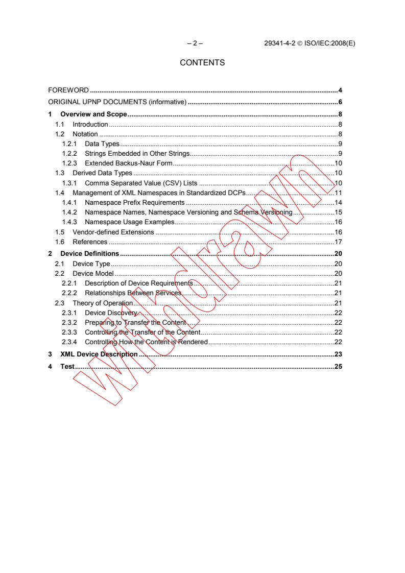 ISO/IEC 29341-4-2:2008 - part of the UPnP Device Architecture family - defines the Audio Video Device Control Protocol (Level 2) Media Renderer Device. This standard specifies a MediaRenderer device template for Consumer Electronics (CE) that can discover, receive and render AV content over a home or local network. It is designed for pervasive, peer-to-peer network connectivity across ad-hoc or unmanaged environments (home, small business or public spaces) and is compliant with UPnP Device Architecture v1.0.