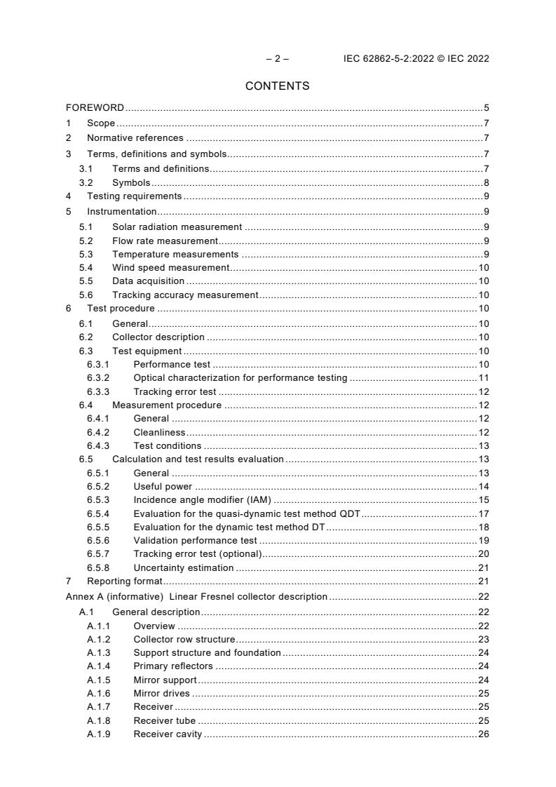 Keywords: IEC 62862-5-2, linear Fresnel collectors, solar thermal electric plants, optical performance, thermal performance, tracking accuracy, outdoor testing, incidence angle modifier, quasi-dynamic test, dynamic test, in‑situ testing.