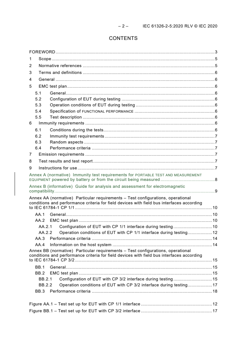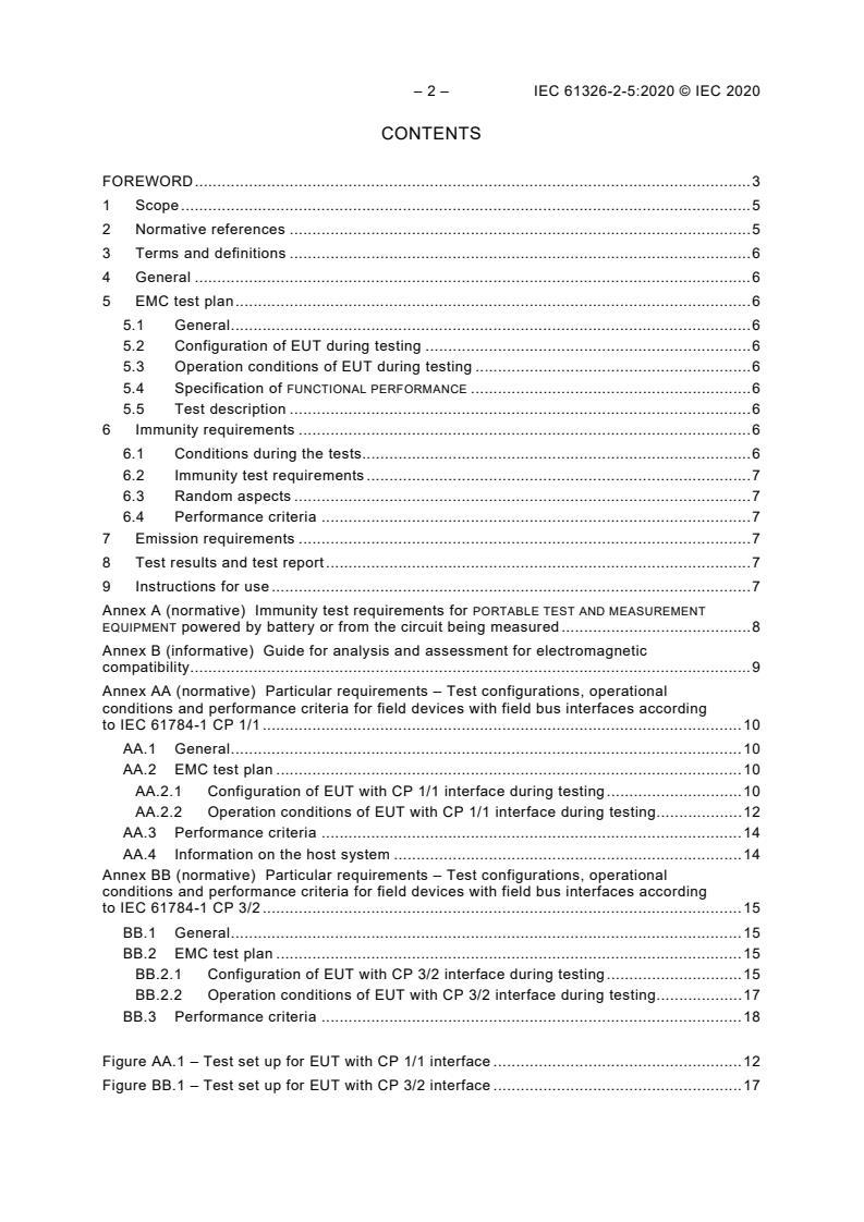 IEC 61326-2-5:2020 treats the particular features for EMC testing of field devices with field bus interfaces. This part of IEC 61326 covers only the field bus interface of the equipment. This part refers only to field devices intended for use in process control and process measuring. In this document, field devices with interfaces according to IEC 61784-1:2019, CP 3/2 and CP 1/1 as defined in IEC 61784 are covered. Other field bus interfaces may be included in future editions of this document.